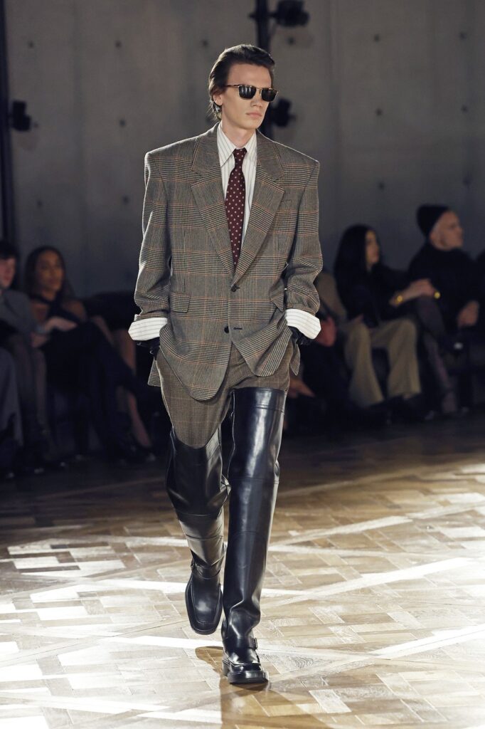 Ipak, Vaccarello nije samo evocirao prošlost. Njegova interpretacija muževnosti danas podrazumeva sofisticiranog muškarca koji suvereno nosi kožu – bilo kroz duge kapute koji deluju autoritativno, bilo kroz kratke jakne koje prizivaju subverzivni duh osamdesetih. Čizme do butina, koje su nosili svi modeli, dodatno su podcrtale ideju o granici između formalnog i provokativnog.