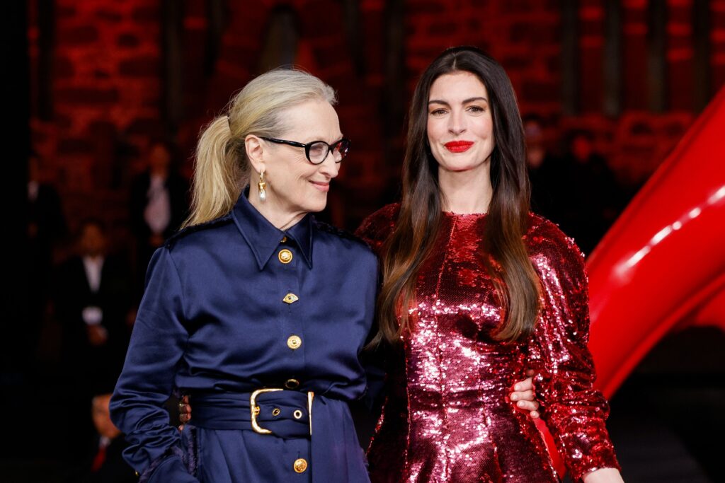 Streep je, s druge strane, u potpunosti prigrlila svoju unutrašnju Mirandu Priestly. Možda se sećate crvene cipele sa postera originalnog filma The Devil Wears Prada, gde je štikla bila zamenjena vilama. Ovoga puta, dobitnica Oskara odala je počast toj kultnoj slici ne samo noseći jarko crvene cipele sa otvorenom petom, već i birajući potpuno monohromatski izgled — bluzu sa mašnom oko vrata, jednoredni sako i pantalone širokih nogavica Dolce&Gabbana, sve u istoj nijansi crvene. Kombinaciju je upotpunila naočarima mačkastog oblika u boji brusnice i zlatnim karika minđušama brenda Fope.