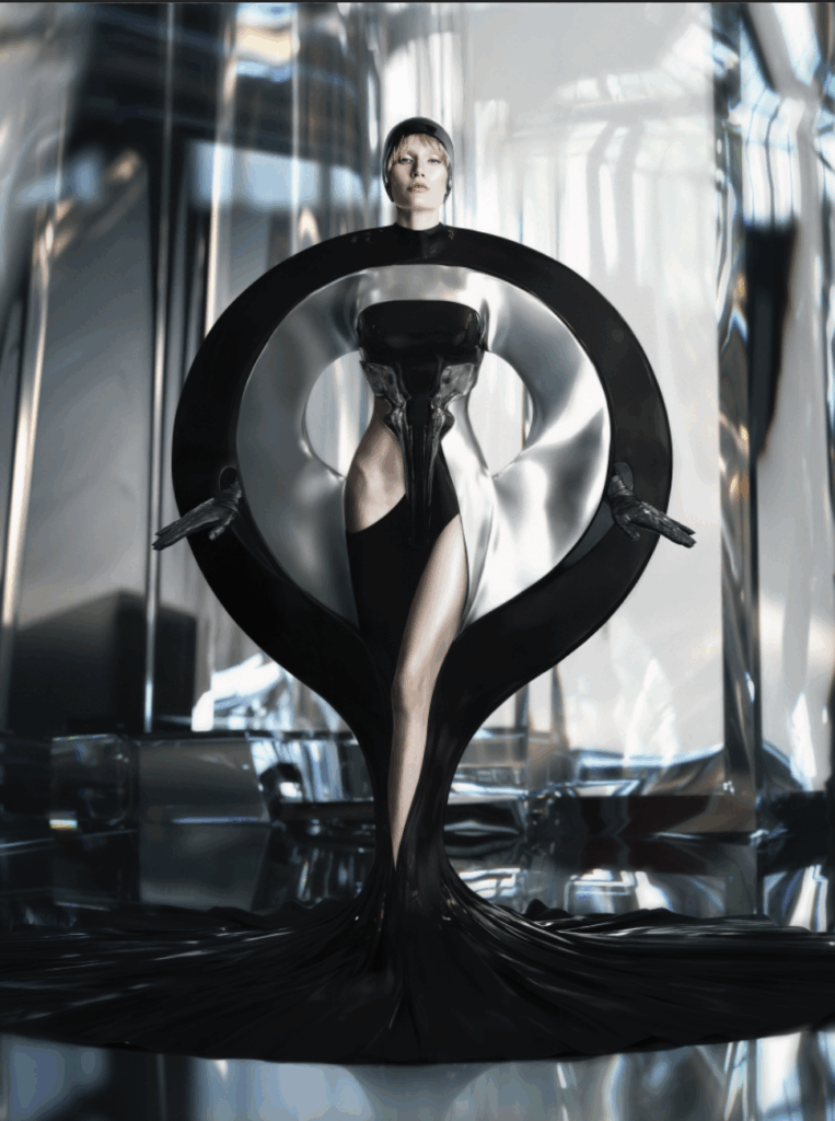 The costumes appear forged from textured with car painted metal: at once monumental and supple, they merge the aesthetics of retro-futurism with the sensuality of the human form. The inspiration draws from the sculptures of Allen Jones. His sculptures, in which the human body becomes an architectural object, set the main direction—an exploration of form subordinated to design and a provocative fusion of eroticism and alienation. Pierre Cardin. His cosmic retrofuturism of the 1970s and architectural approach to tailoring became our starting point in creating a sense of a “spacesuit” for the digital age.
