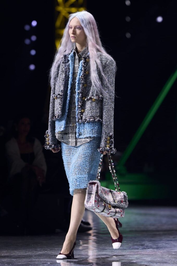 Hromirane i svetlucave ekstenzije predstavljaju neočekivani i osvežavajući detalj na pistama, pokazujući da hladne metalik nijanse postaju ključni trend u beauty svetu za jesen 2026. Chanel je dokazao da u svetu visoke mode i glamura, frizura može biti jednako upečatljiva kao i sam outfit.