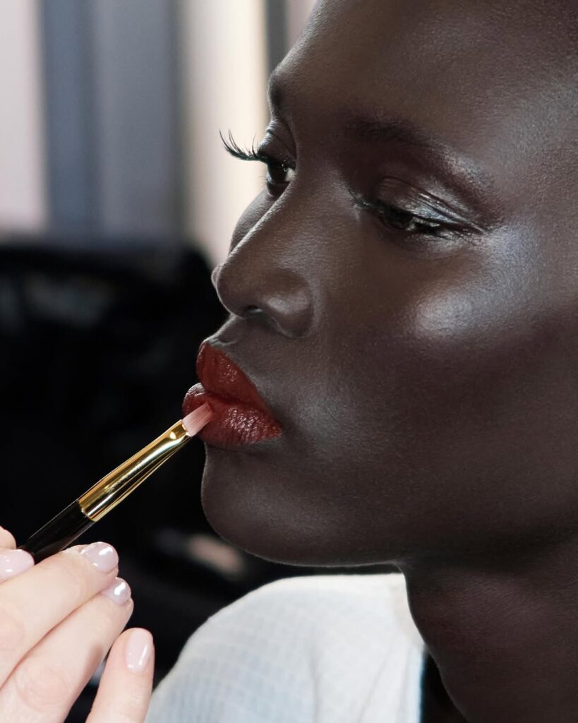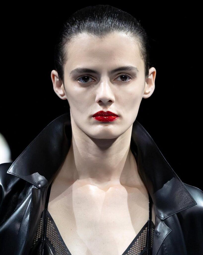 Na reviji Tom Forda, usne su bile glavni adut – sjajne, duboke crvene nijanse, nalik karamelizovanom jabukom. Makeup artistkinja Lucy Bridge postigla je efekat „lakiranih“ usana slojevitim nanošenjem mat karmina, ruža sa sjajem i završnim slojem providnog sjaja. Rezultat je elegantan i senzualan izgled koji lako možemo postići kombinovanjem ruža u vinskim tonovima i bezbojnog sjaja.
