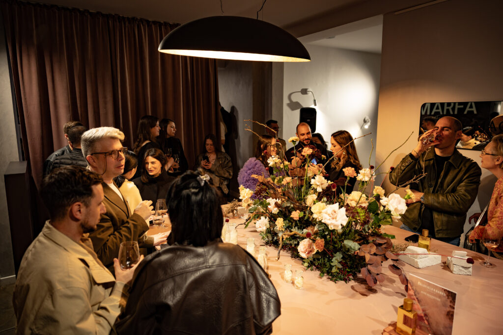 Ambijent Marfa Flowershop-a bio je transformisan u produžetak same mirisne priče, prostor ispunjen slojevima tekstura, svežeg cveća, nežnim tonovima i suptilnim kontrastima koji su reflektovali karakter parfema. Cvetne instalacije nisu bile samo dekor, već interpretacija mirisa u vizuelnoj formi, stvarajući atmosferu u kojoj se brišu granice između prirode, umetnosti i parfimerije.