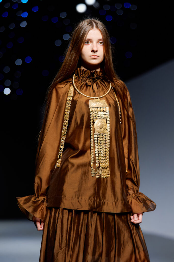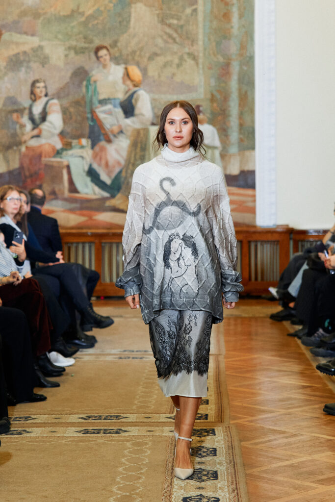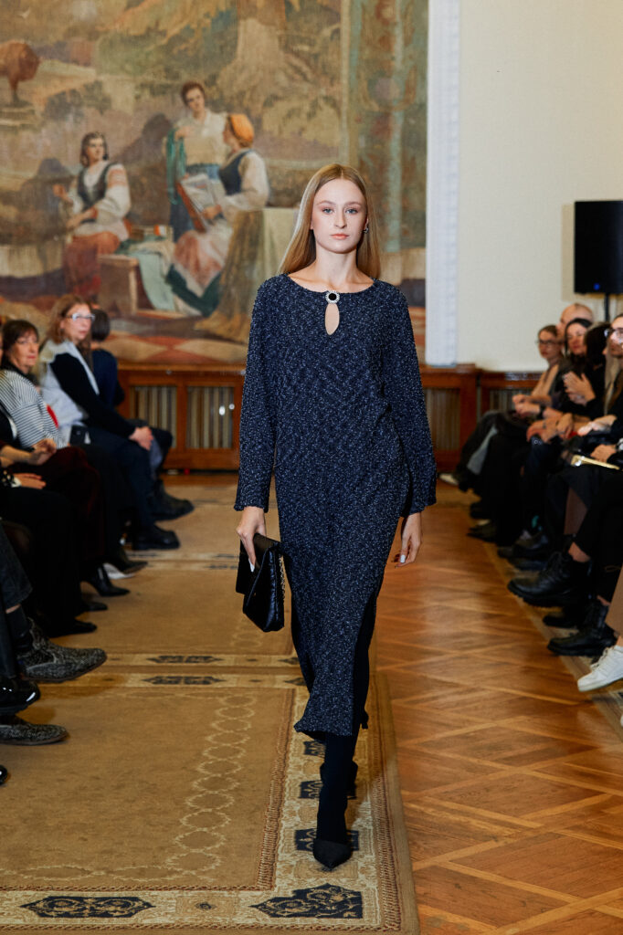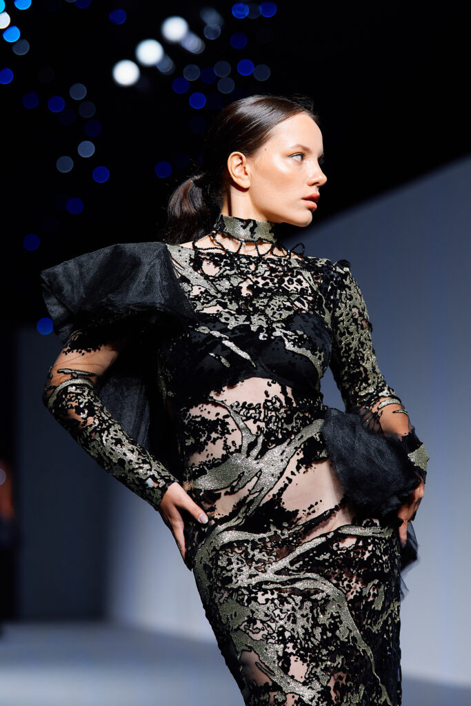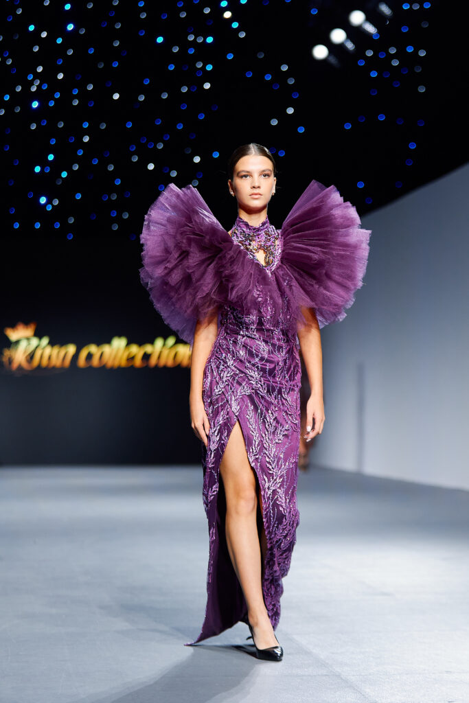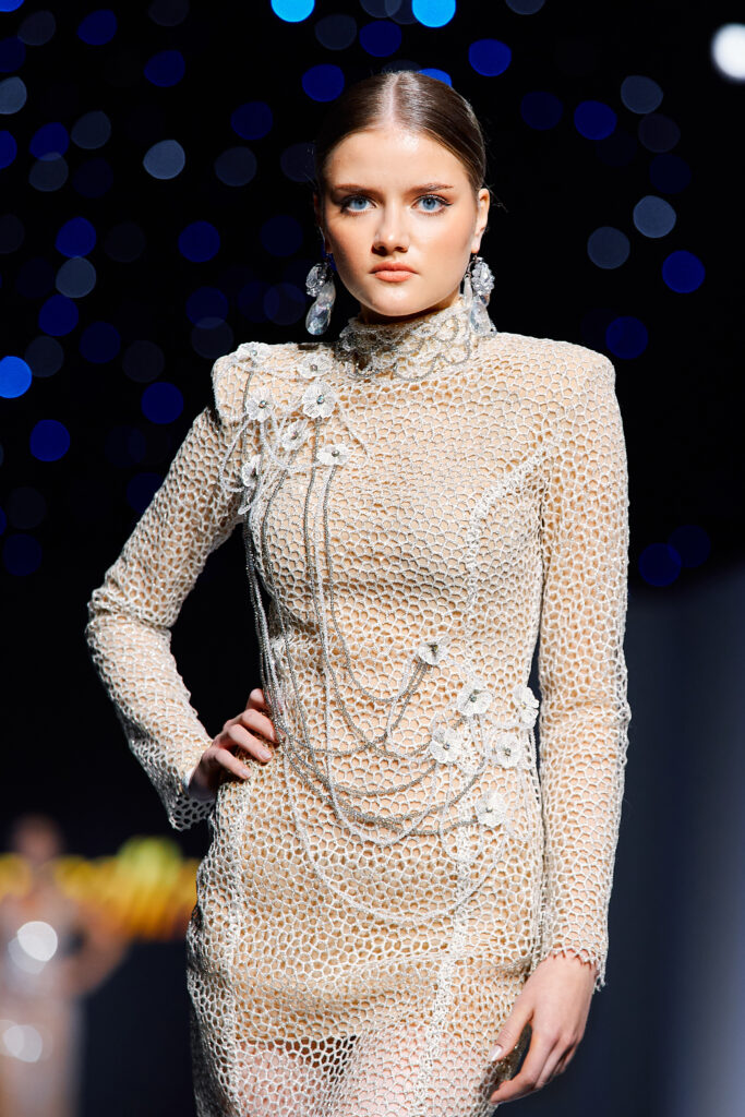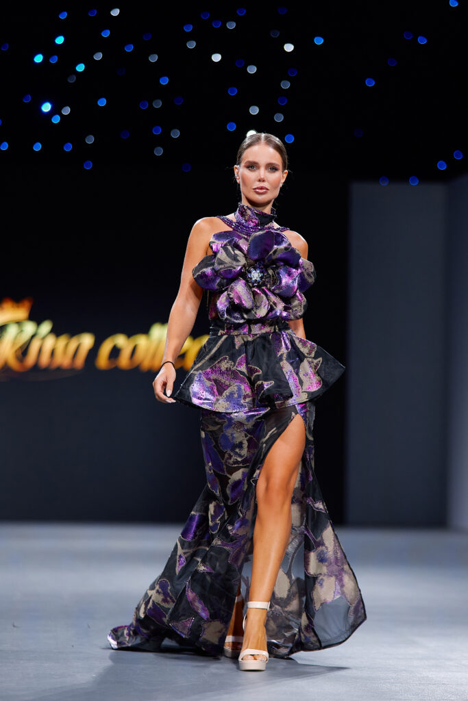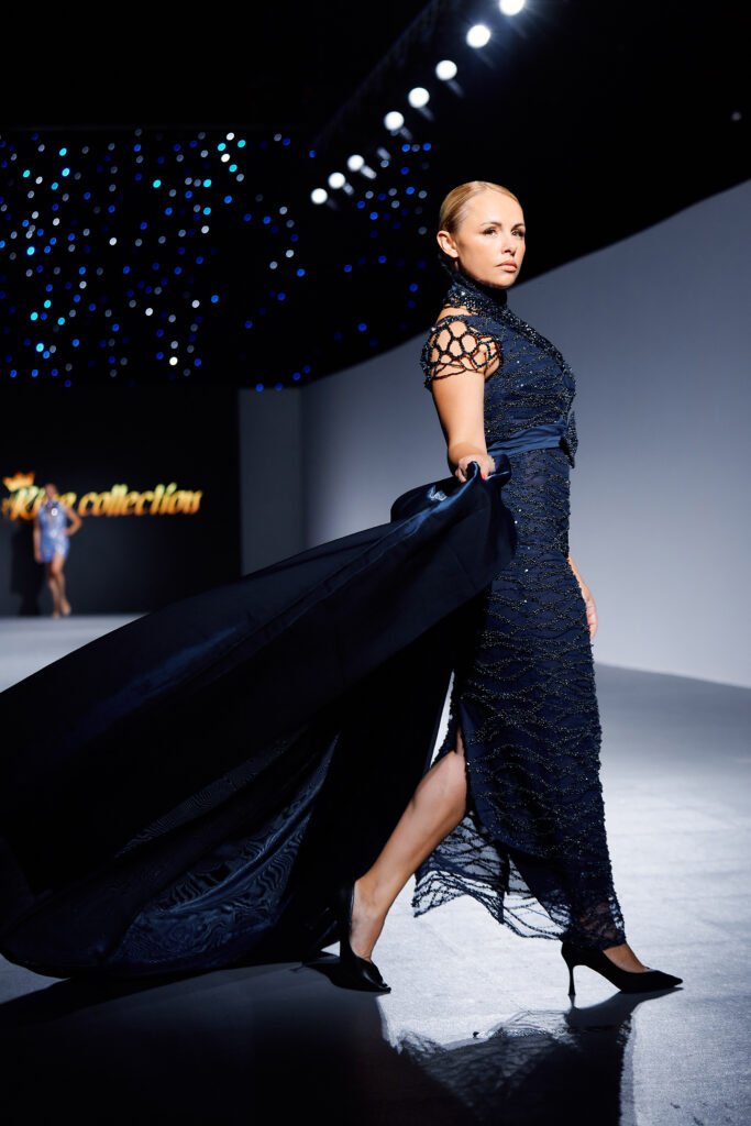 Designer Katrina presented a collection of evening dresses entitled “Woven Destinies.” A story about the interweaving of lives, about women and for women, where each look becomes a separate narrative about personal experiences and bright turning moments. The dresses reflect the multilayered nature of character: strength and vulnerability, determination and tenderness, aspiration and memory. Exquisite textured fabrics, decorations of intertwined threads, and handwork create an allegory of a woven destiny.