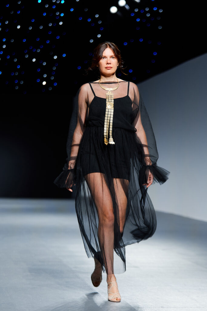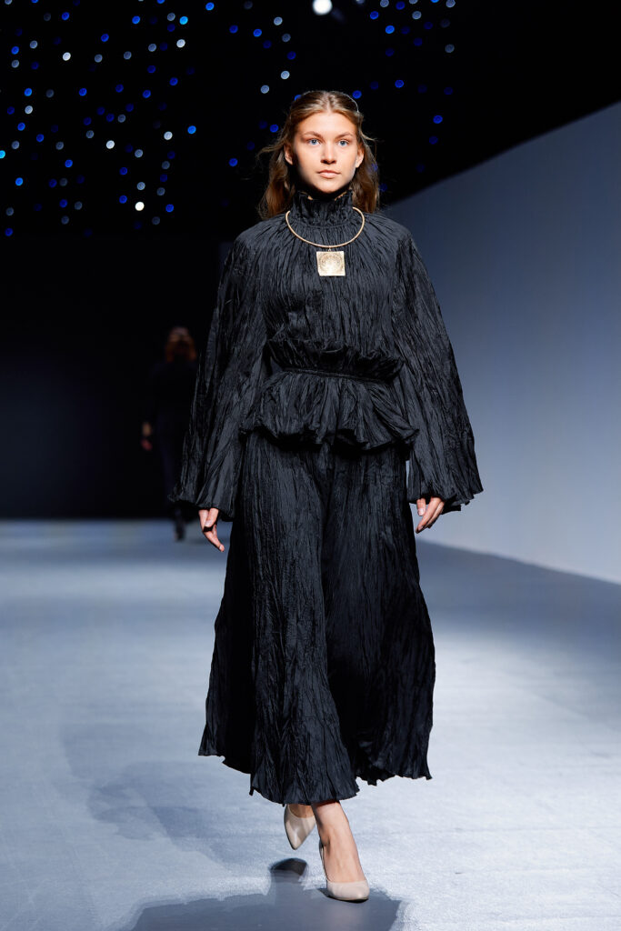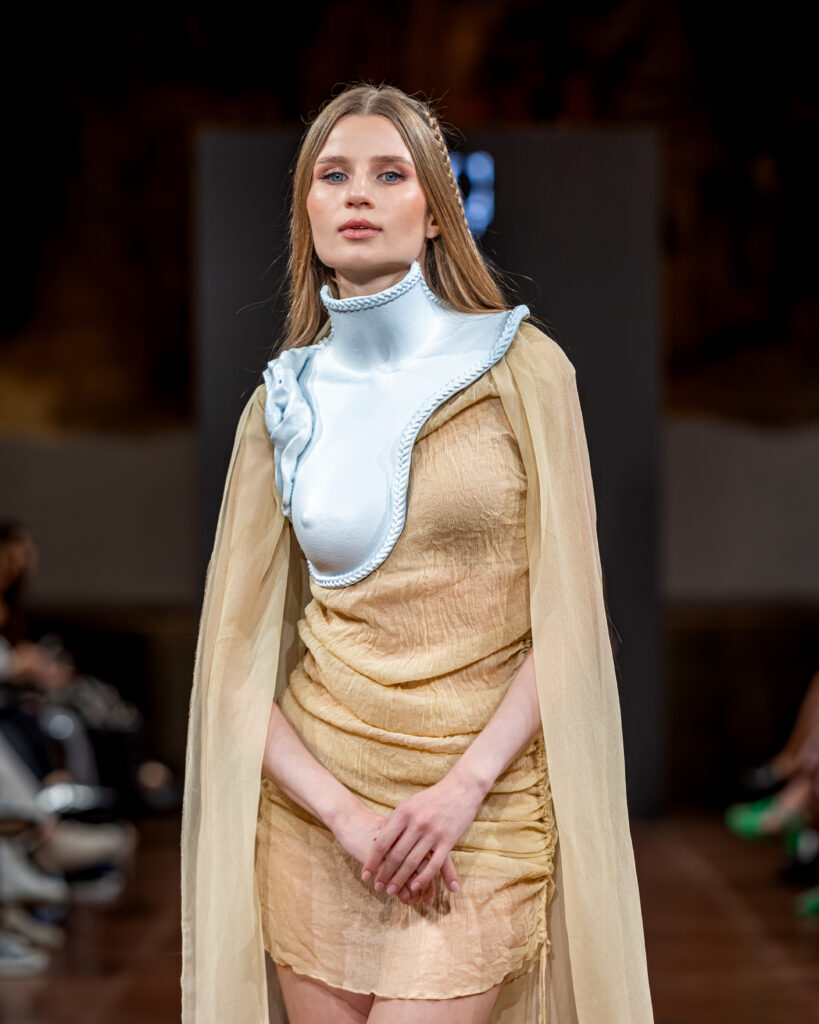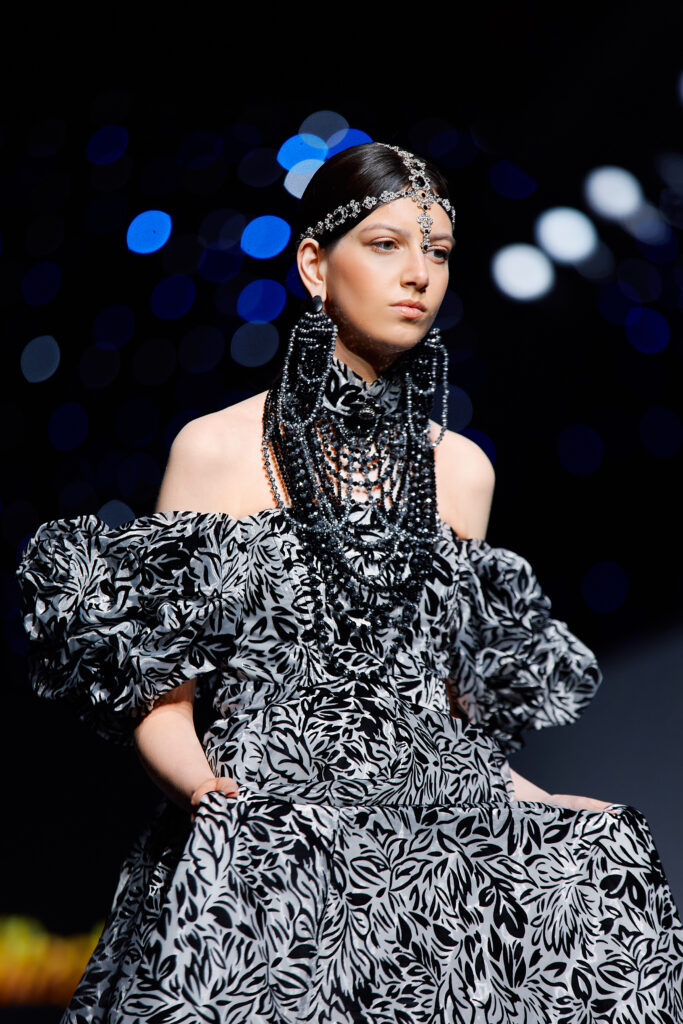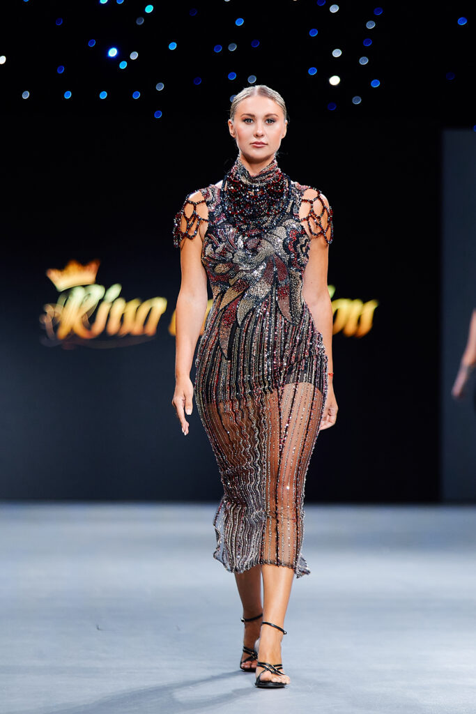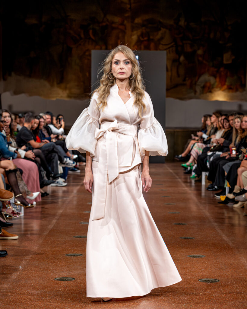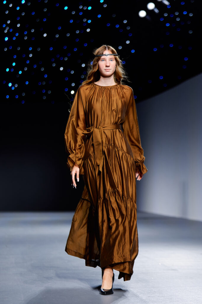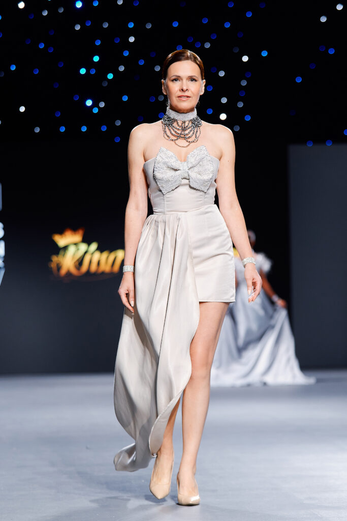 Designer Katrina presented a collection of evening dresses entitled “Woven Destinies.” A story about the interweaving of lives, about women and for women, where each look becomes a separate narrative about personal experiences and bright turning moments. The dresses reflect the multilayered nature of character: strength and vulnerability, determination and tenderness, aspiration and memory. Exquisite textured fabrics, decorations of intertwined threads, and handwork create an allegory of a woven destiny.