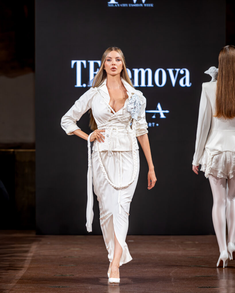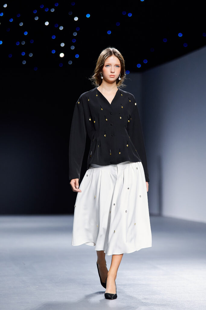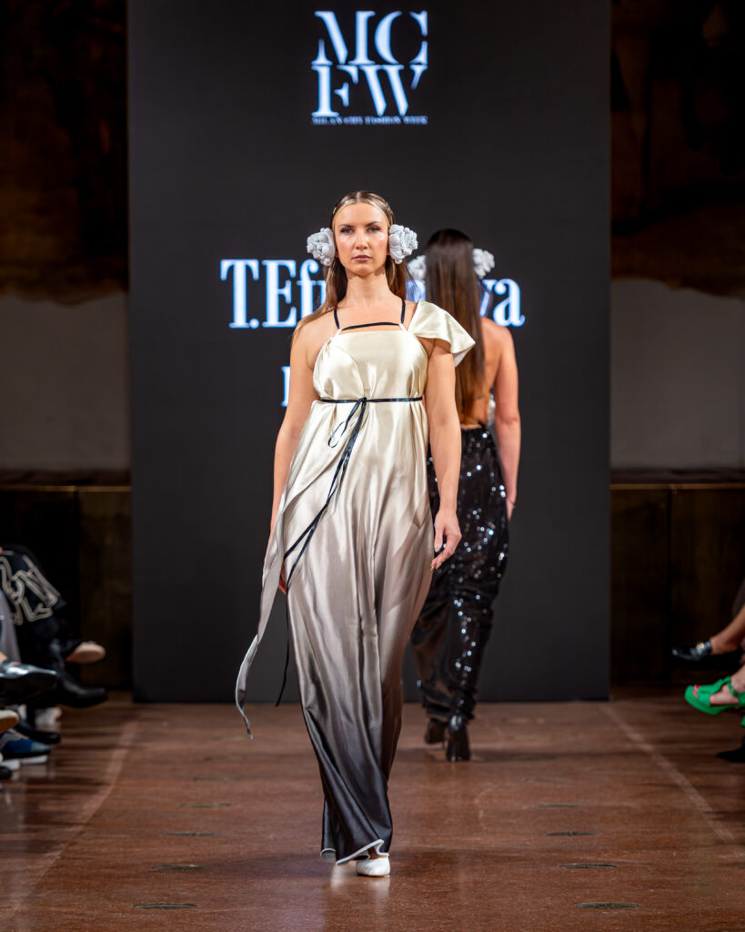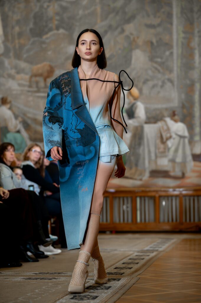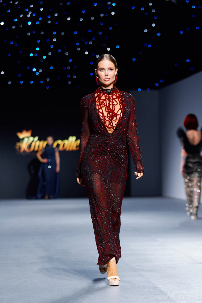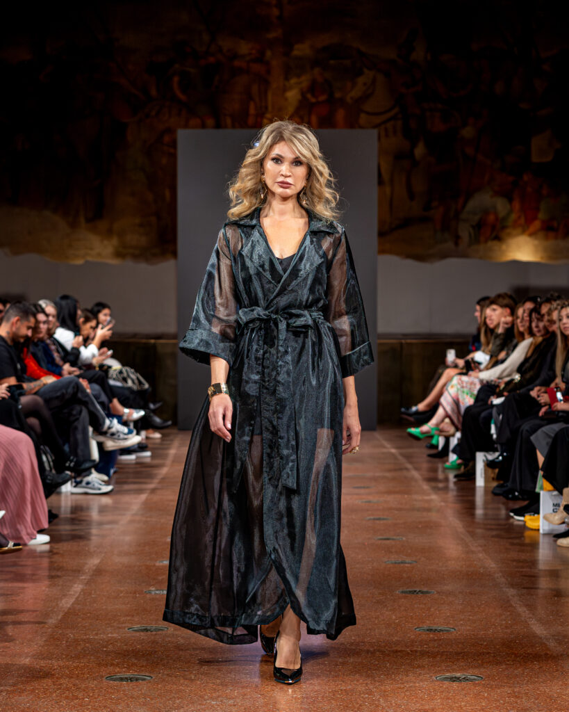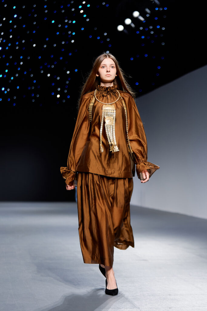 Designer Katrina presented a collection of evening dresses entitled “Woven Destinies.” A story about the interweaving of lives, about women and for women, where each look becomes a separate narrative about personal experiences and bright turning moments. The dresses reflect the multilayered nature of character: strength and vulnerability, determination and tenderness, aspiration and memory. Exquisite textured fabrics, decorations of intertwined threads, and handwork create an allegory of a woven destiny.