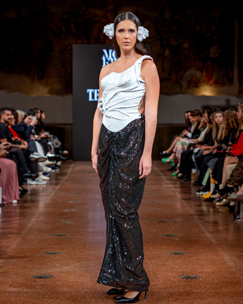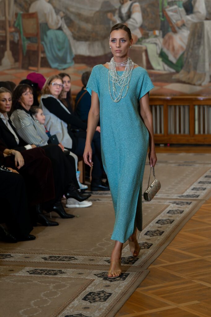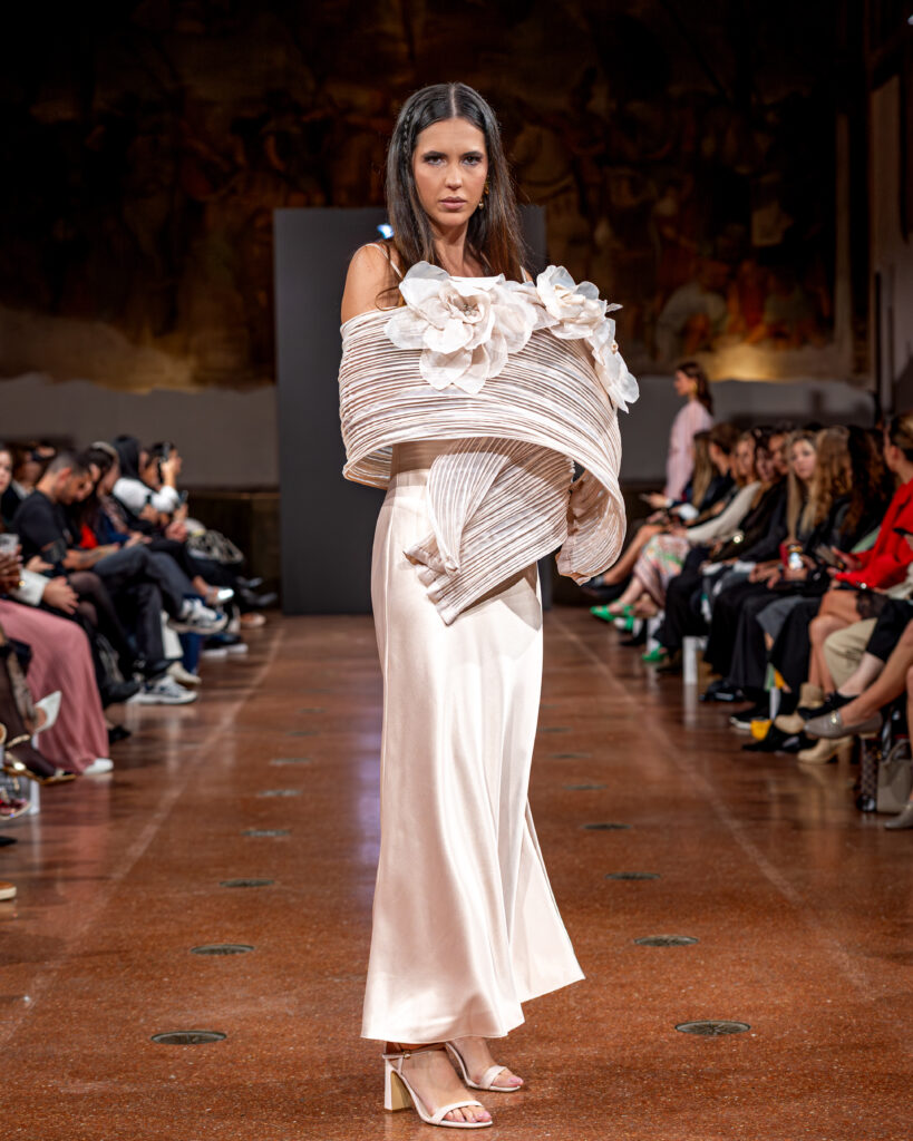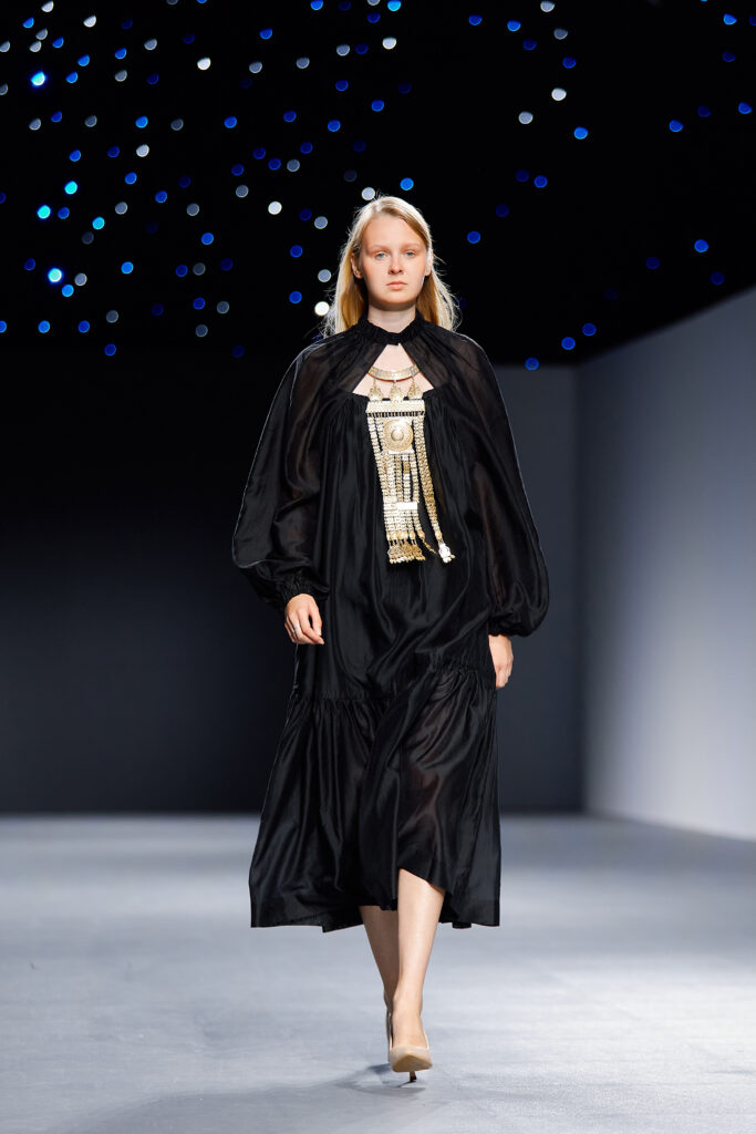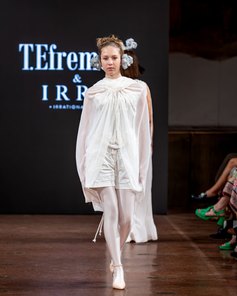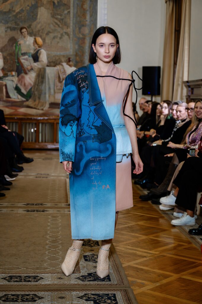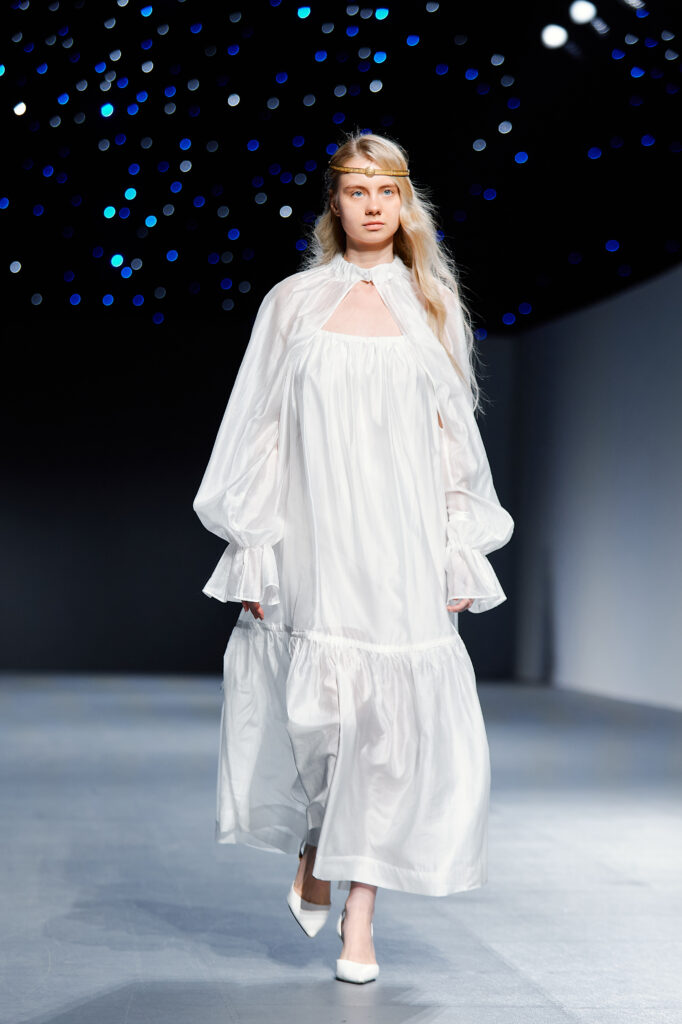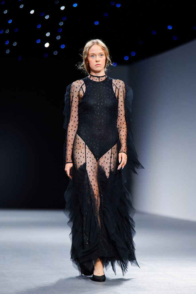 Designer Katrina presented a collection of evening dresses entitled “Woven Destinies.” A story about the interweaving of lives, about women and for women, where each look becomes a separate narrative about personal experiences and bright turning moments. The dresses reflect the multilayered nature of character: strength and vulnerability, determination and tenderness, aspiration and memory. Exquisite textured fabrics, decorations of intertwined threads, and handwork create an allegory of a woven destiny.
