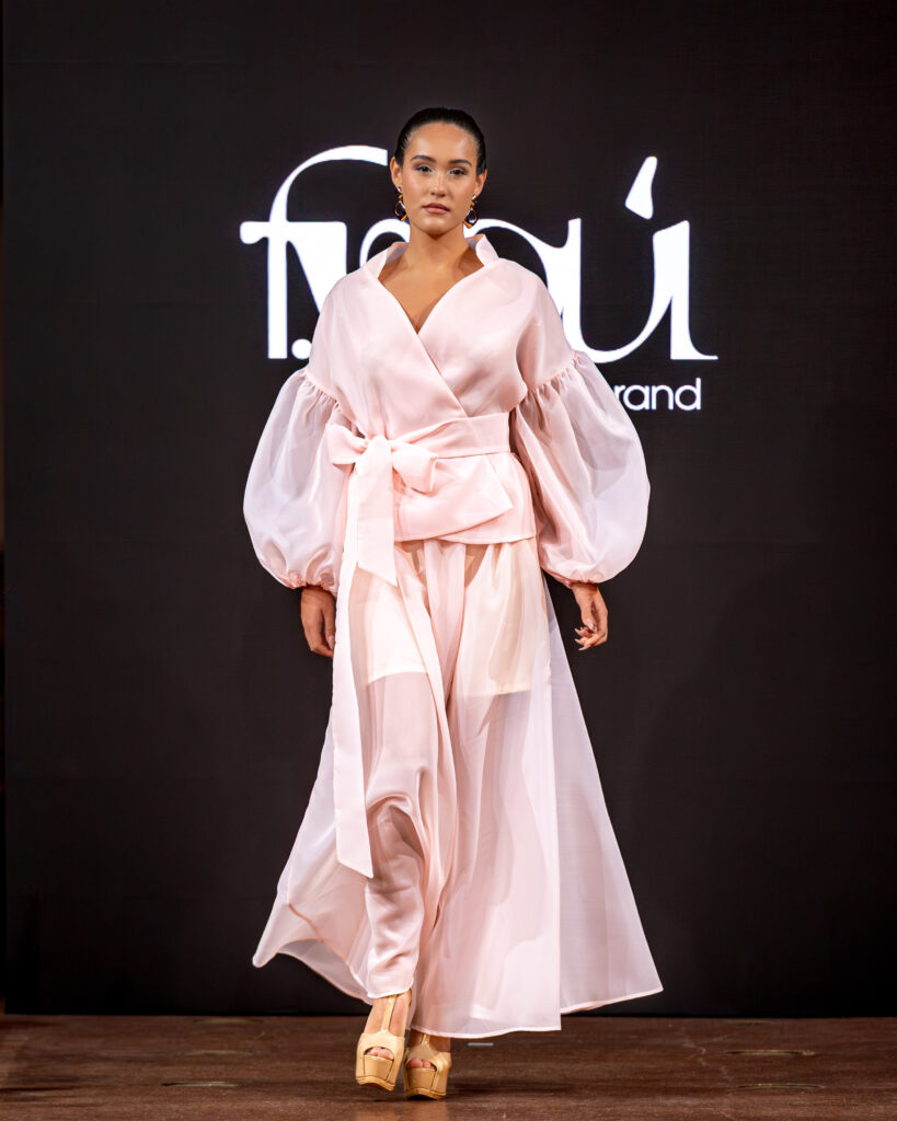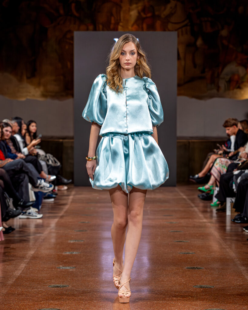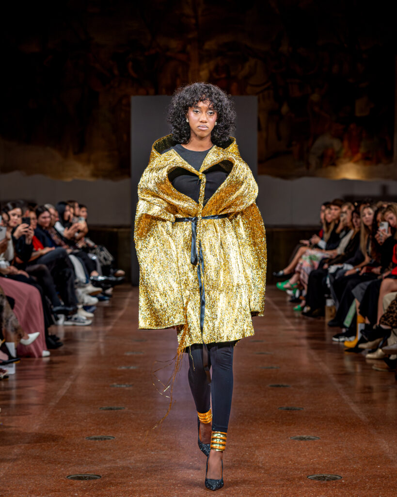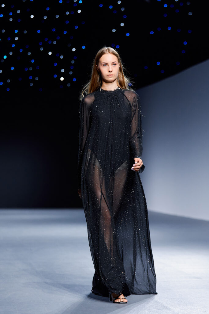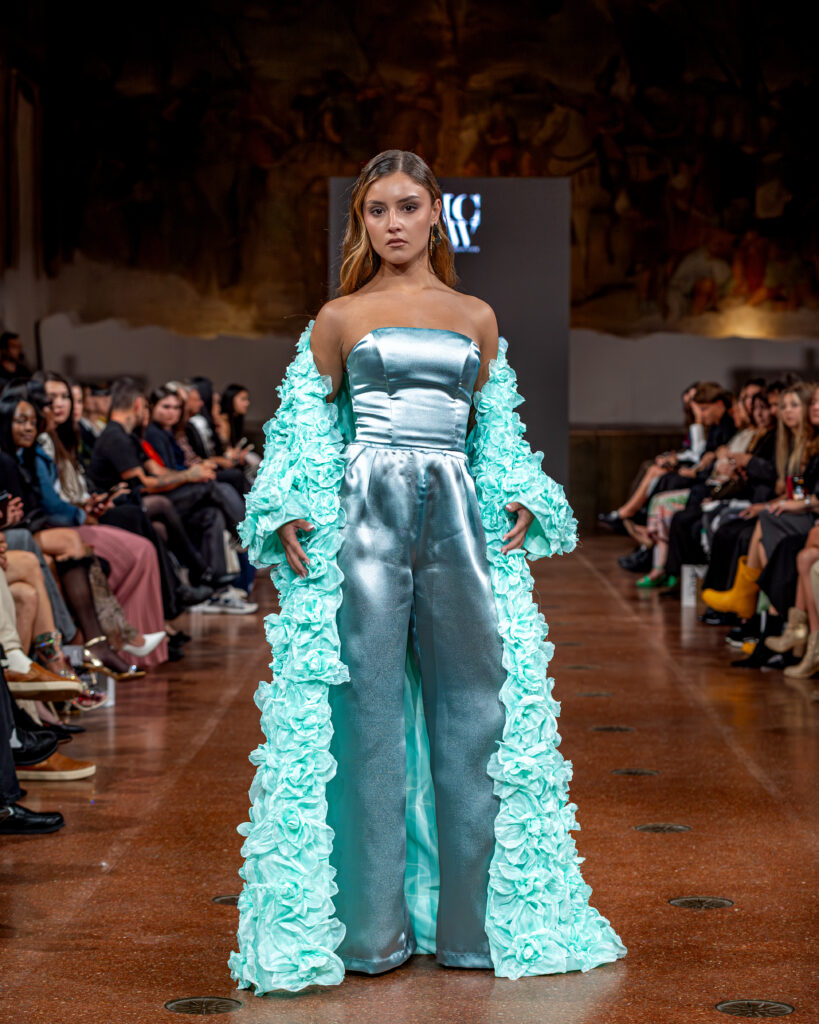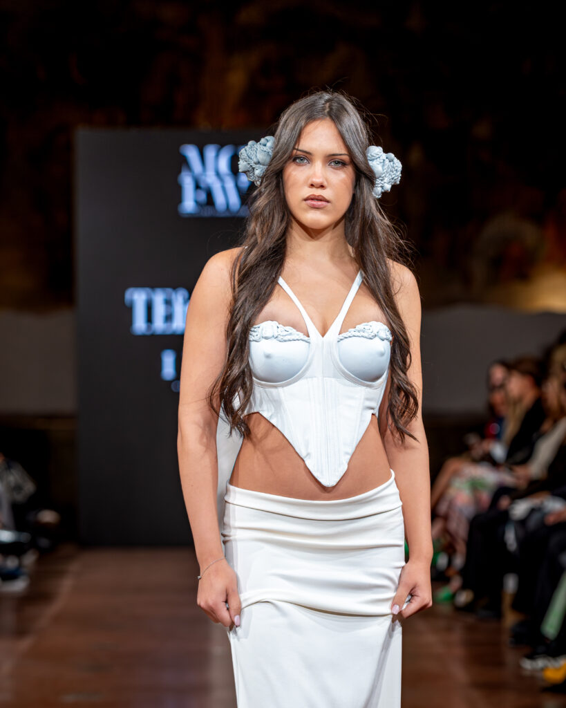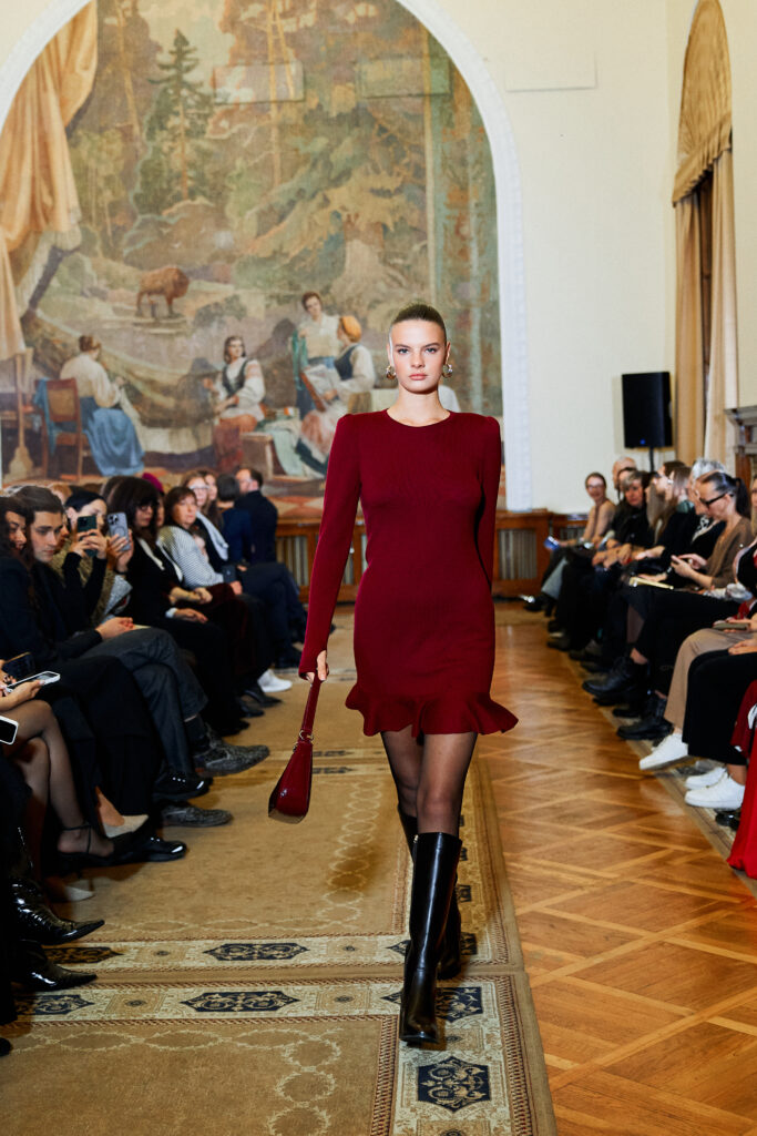 Designer Katrina presented a collection of evening dresses entitled “Woven Destinies.” A story about the interweaving of lives, about women and for women, where each look becomes a separate narrative about personal experiences and bright turning moments. The dresses reflect the multilayered nature of character: strength and vulnerability, determination and tenderness, aspiration and memory. Exquisite textured fabrics, decorations of intertwined threads, and handwork create an allegory of a woven destiny.