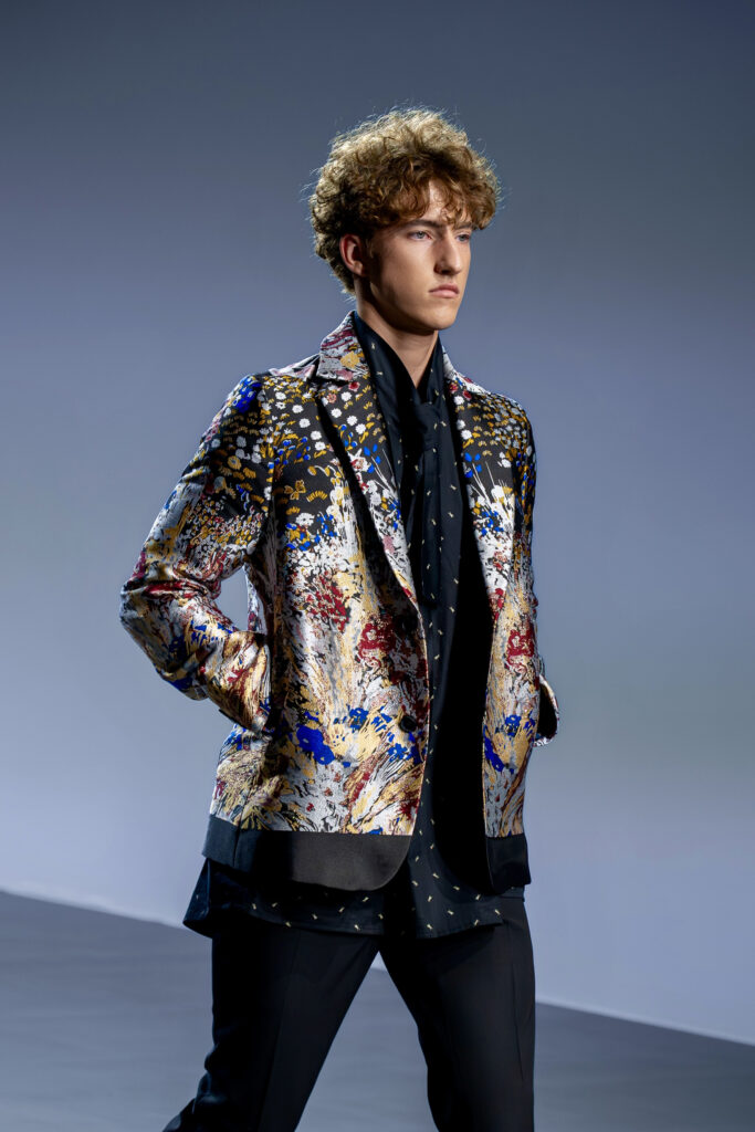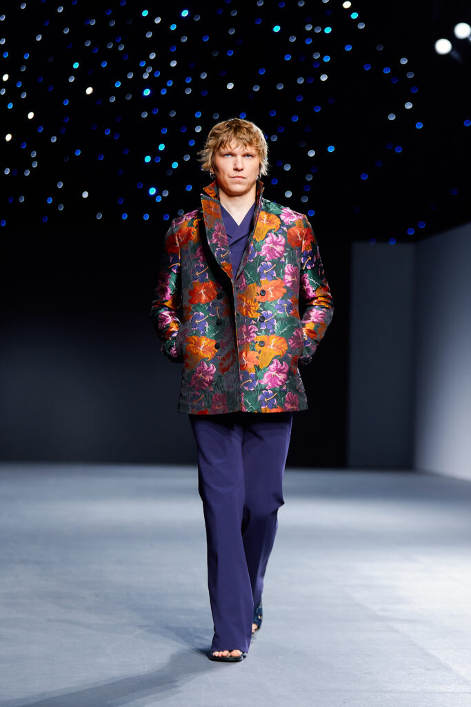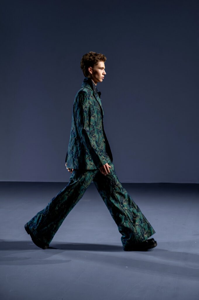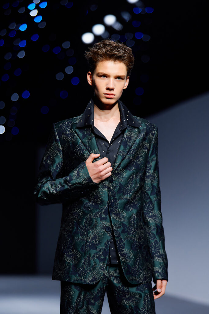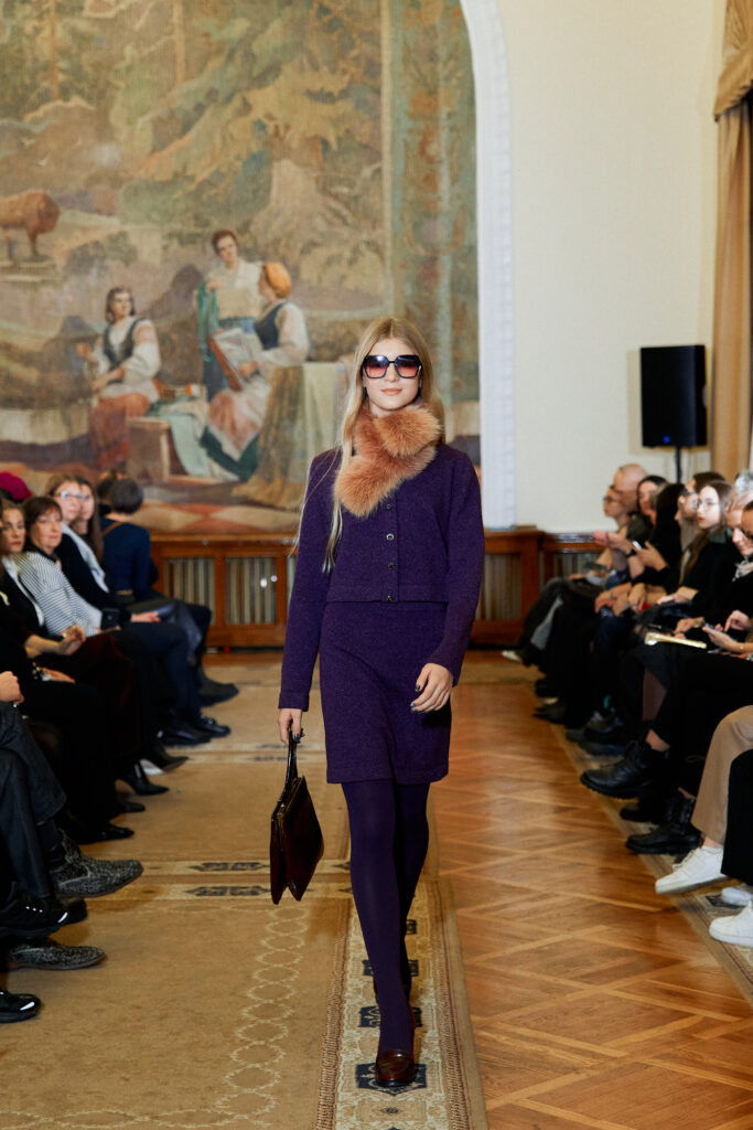 Designer Lyudmila Tarakanova creates menswear. The colors of this season echo the palette of Chagall’s works — landscapes of his homeland and the iconic “Lovers” series. A rich range of shades — black, green, blue, purple, and intense fuchsia — is complemented by jacquard fabrics with floral motifs.