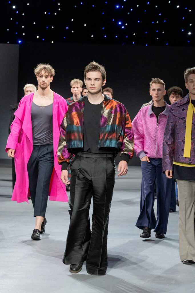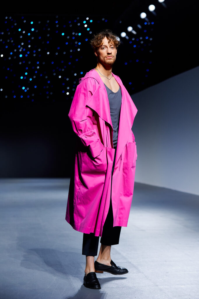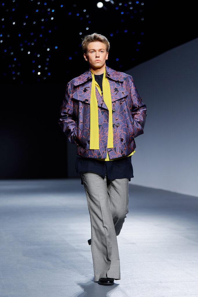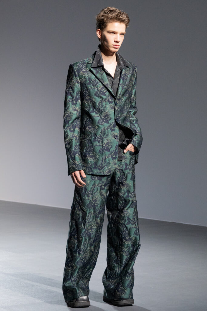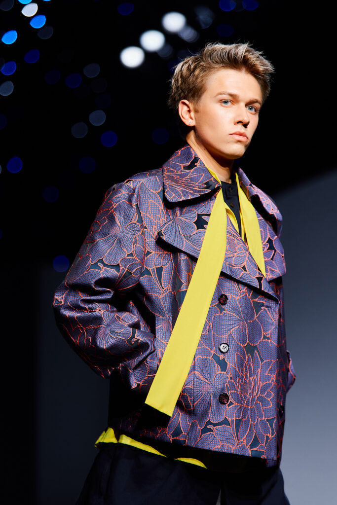 Designer Lyudmila Tarakanova creates menswear. The colors of this season echo the palette of Chagall’s works — landscapes of his homeland and the iconic “Lovers” series. A rich range of shades — black, green, blue, purple, and intense fuchsia — is complemented by jacquard fabrics with floral motifs.