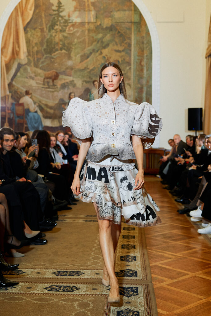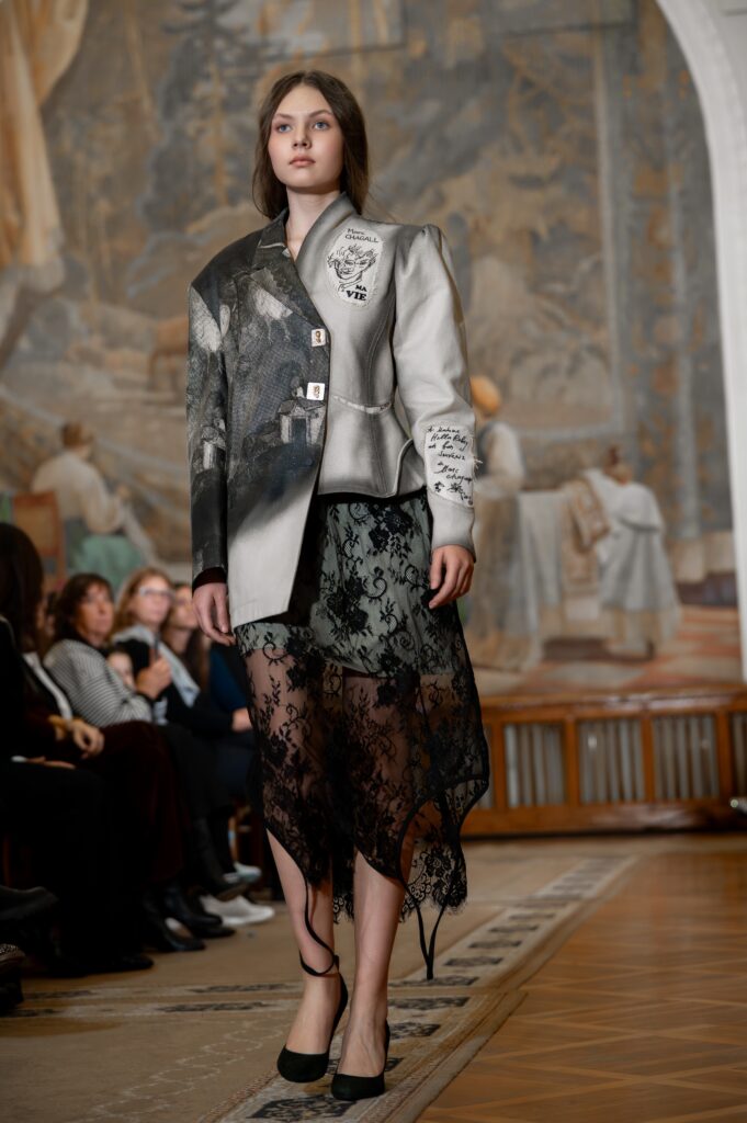 The collection based on Chagall’s works was created as if writing a romantic novella in the language of unusual structural lines, stylistic combinations, colors, varied textures, and materials. Suits, jumpsuits, vests, and cardigans are expressive and unconventional: many of them adorned with recognizable portraits and elements of world-famous works.