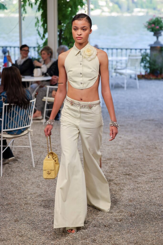 Na samoj pisti našli su se i svileni detalji proizvedeni upravo u regionu jezera Komo — marame koje su se ovog puta pretvorile u kaiševe za sandale s potpeticom. Chanel je nedavno i zvanično učvrstio svoju vezu sa ovim krajem, preuzevši udeo u lokalnom proizvođaču Mantero, koji već decenijama isporučuje najfinije tkanine za bluze i aksesoare. Ova strateška odluka pokazuje kako brend, osim što neguje estetiku, osnažuje i svoje lance snabdevanja — ulažući u očuvanje zanata u vremenu kada globalne ekonomske promene prete opstanku specijalizovanih proizvođača.
