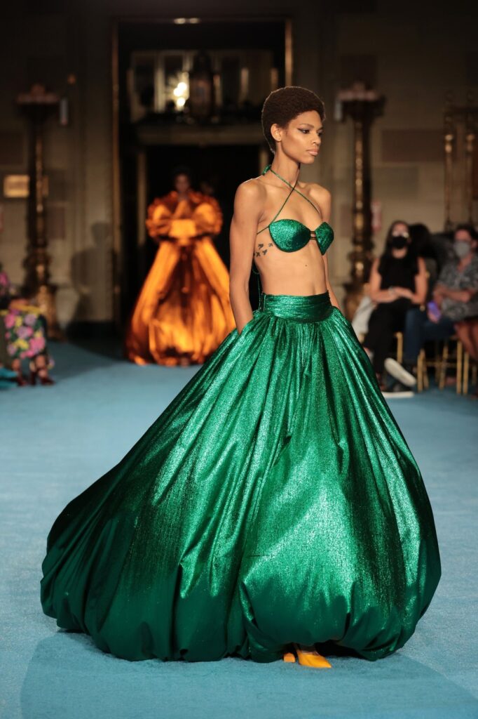 Jedna od najmaštovitijih kolekcija: viktorijanska silueta susreće futurističku energiju. Korseti, puf rukavi, veganska koža, zebra print, providni paneli – Christiano Siriano ovde konstruiše vizuelni dijalog između epoha, dok istovremeno neguje svoju strast prema snažnim, nadrealnim formama.