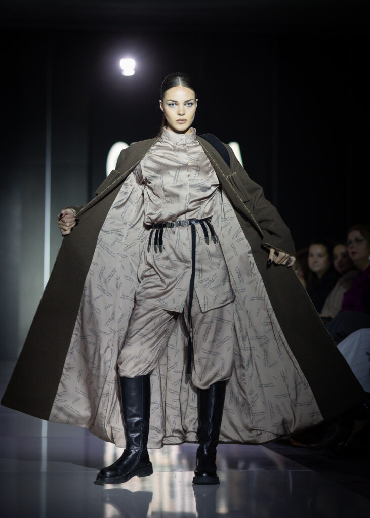 Potpuno drugačije raspoloženje predstavio je mladi brend GEOTREND, koji je pokazao svoju jedinstvenu viziju. Njihova kolekcija odražava brz tempo savremenog života, u kojem se žene neprestano kreću između različitih uloga i okruženja. Trčanje je njihov izvor inspiracije — simbol brzine, fokusa i unutrašnjeg impulsa za kretanjem napred.