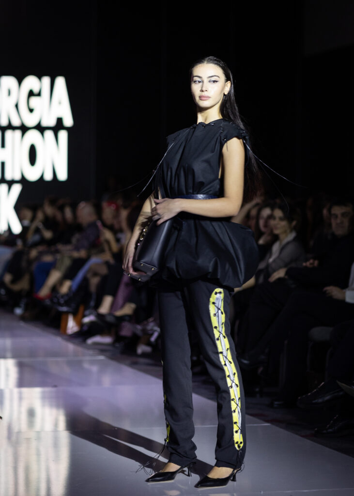 Designer – IA GONIADZE’s collection is a performance of a strong, determined woman who moves confidently through the fast rhythm of modern life. She never loses her balance; the world of “pink glasses” is unfamiliar to her. What matters is seeing life through the real, dark-tinted lens.