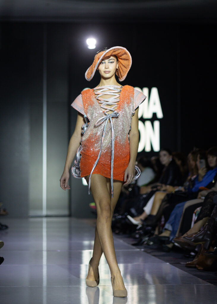 Designer – MARIKA MODEBADZE – presented “The Girl from the Fourth Dimension”, a show that unfolded against live, electrifying music performed together with renowned Georgian artist Giga Papaskiri. They created an atmosphere of a fourth dimension, where vibrant color replaces traditional forms, transforming the visual language of the collection.
