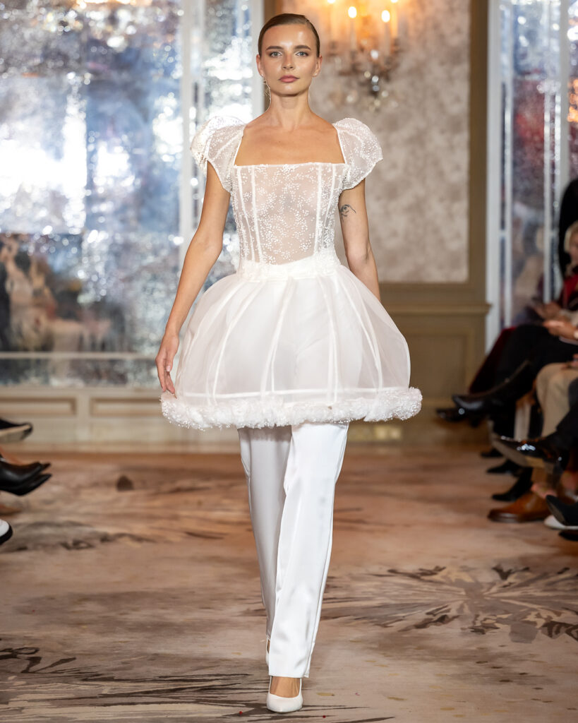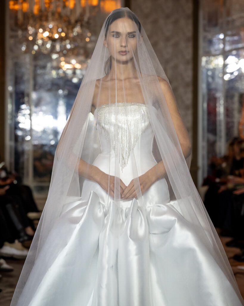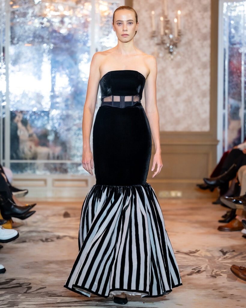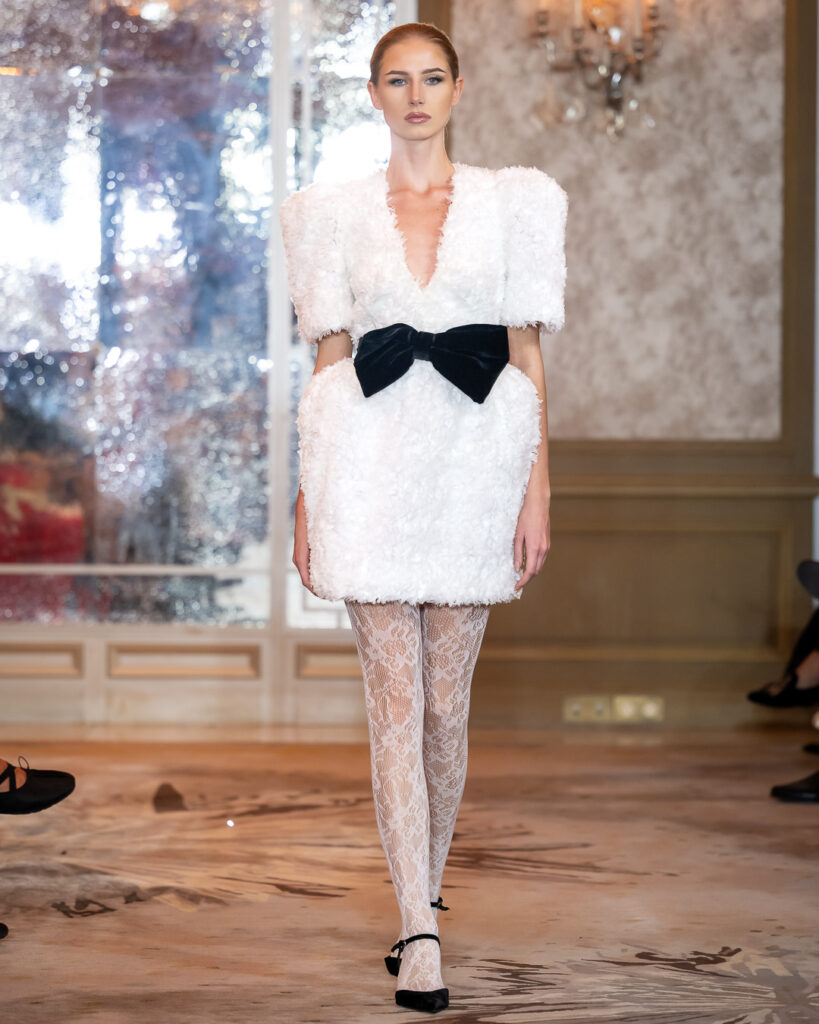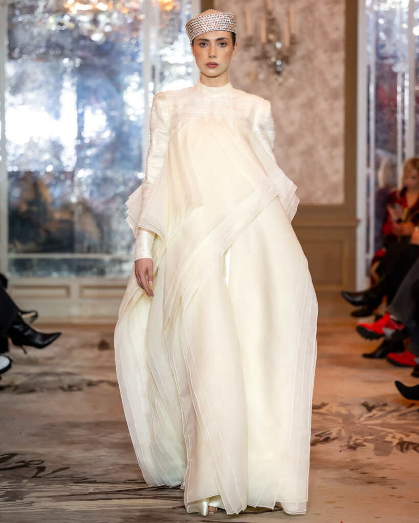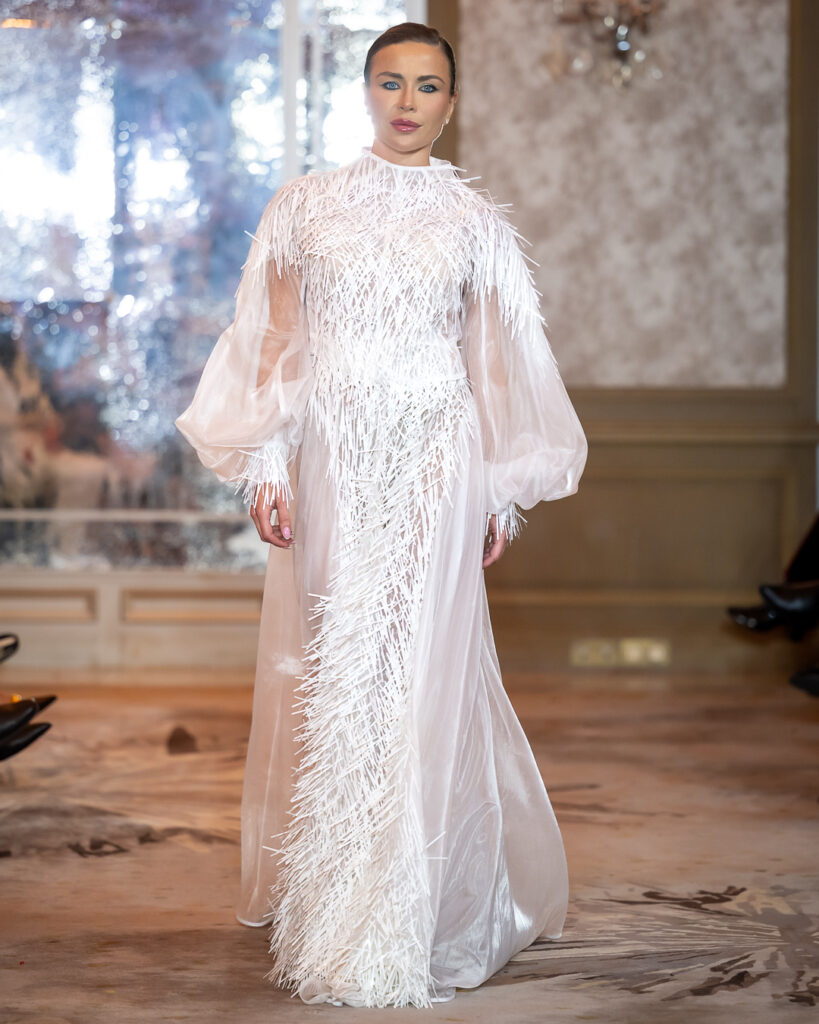 Black-and-white geometric compositions add a graphic edge, while voluminous whites adorned with feather-like detailing introduce a sense of celestial purity. Built on duality, it contrasts architectural structure with fluid drapery, concealment with bold cuts — reminding us that true strength is not loud, but deeply felt.
