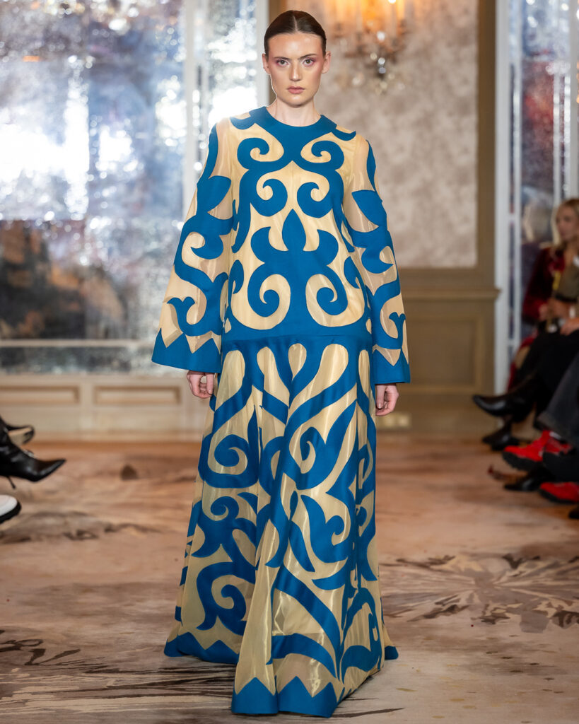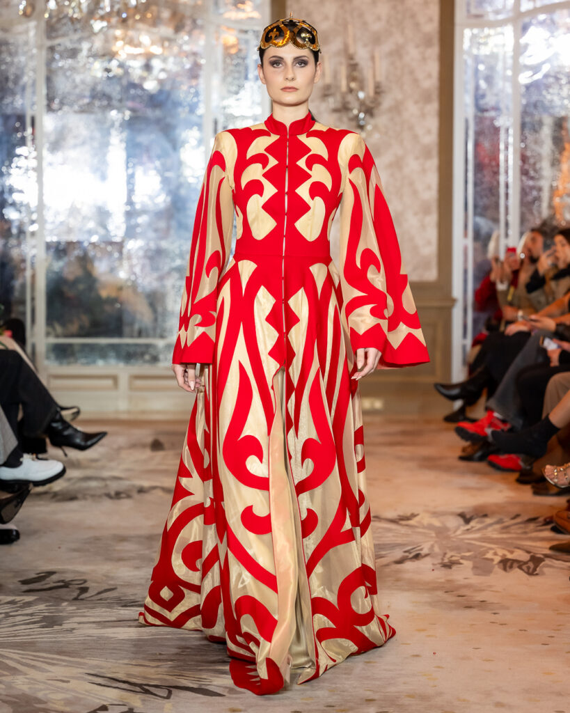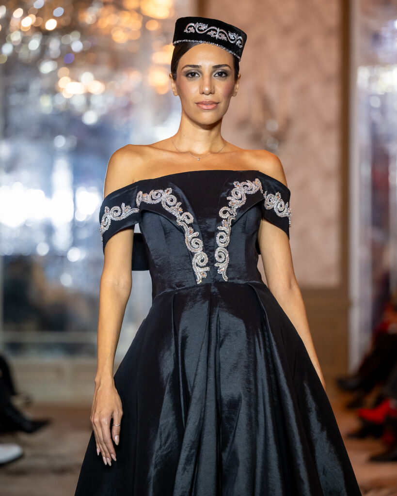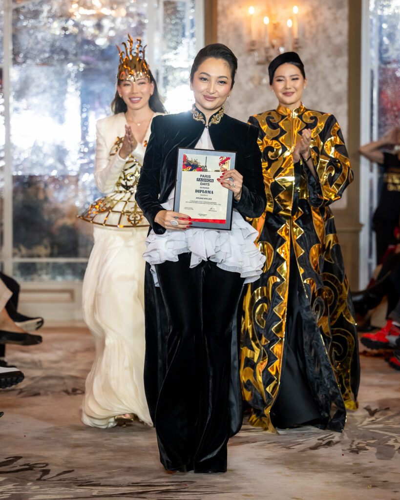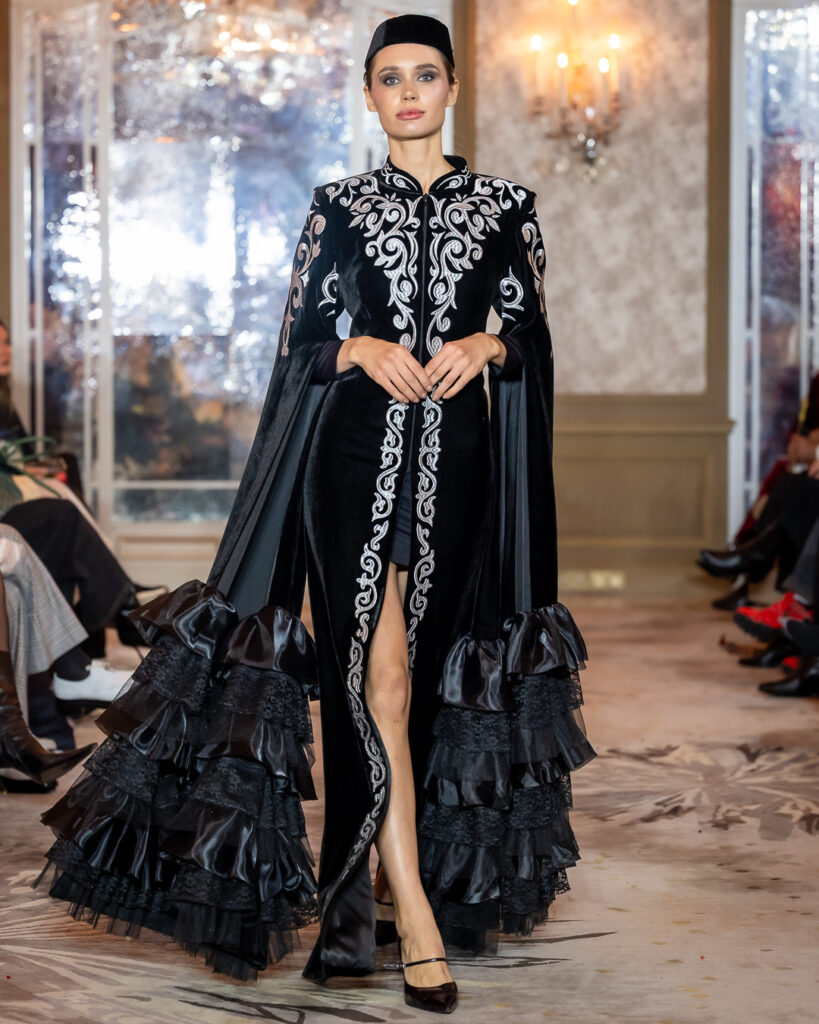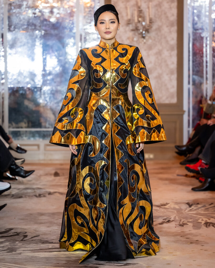 ARUNAZ ATELIER, founded by Nazym Karpikova, presented a collection that beautifully blended contemporary fashion with rich Eastern heritage.