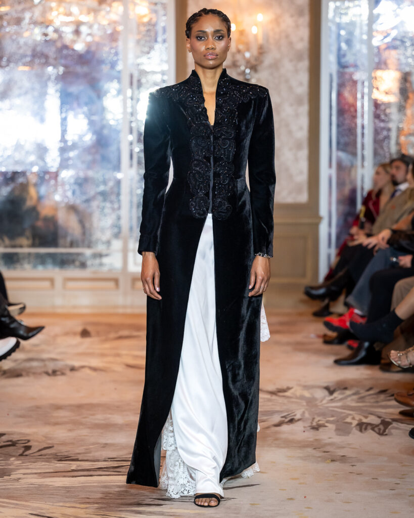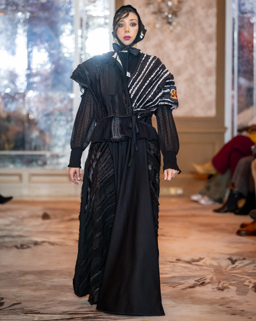 Kharchi’s collection stepped onto the Paris runway like a silent yet powerful hymn — draped in deep blacks, layered textures, and sculptural silhouettes that felt both ancestral and avant-garde.