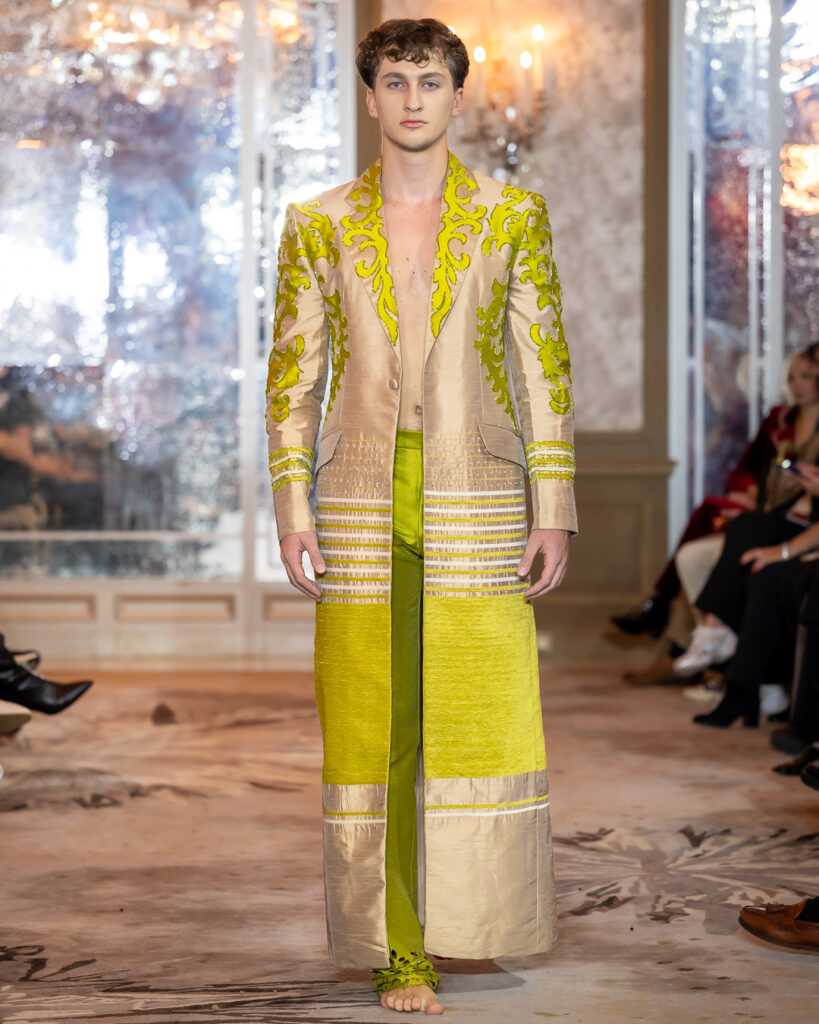 Inspired by both Filipino heritage and the poetry of nature, his designs blended opulence with organic motifs — from crystal-encrusted leaves to sculpted floral appliqués on velvet, silk, and sheer tulle. Deep hues of noir, bronze, and chartreuse stood alongside soft pastels of blush pink and lavender, creating a palette that transitioned seamlessly from strength to serenity.