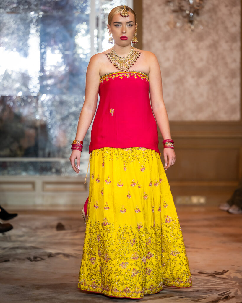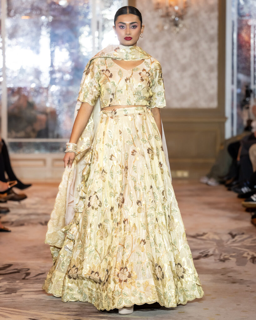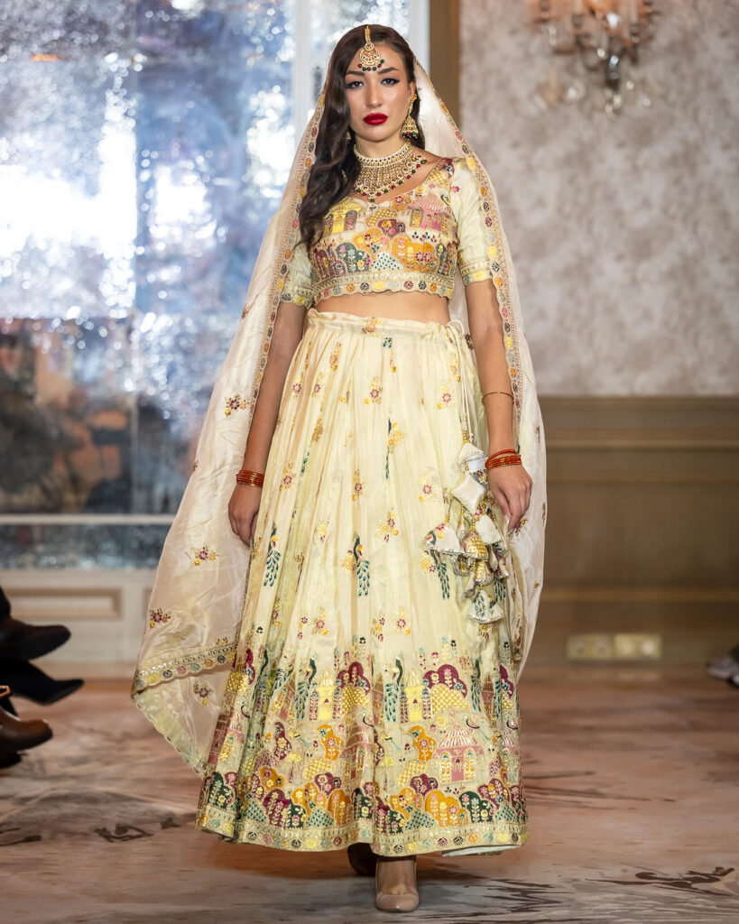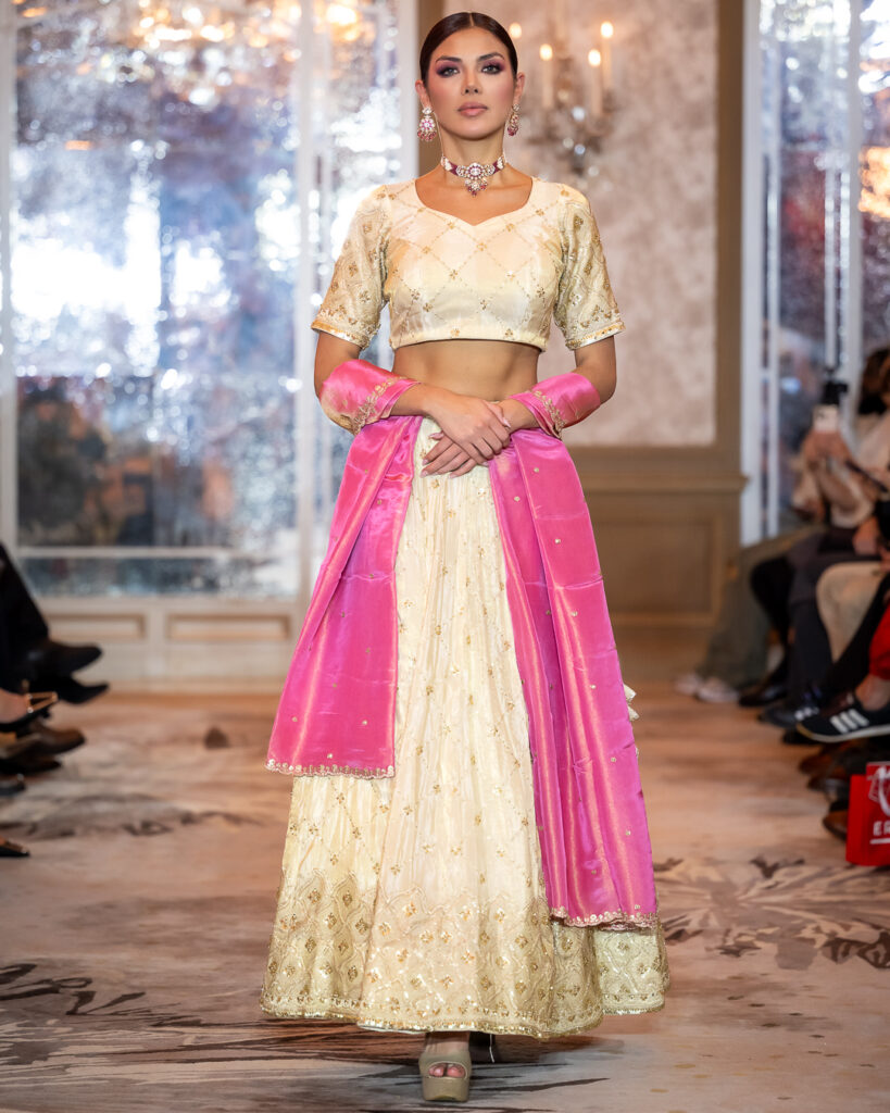 From soft ivory silks and gold metallic weaves to bold contrasts of fuchsia and marigold, each look celebrated the grandeur of ceremonial attire with a contemporary, international sensibility.