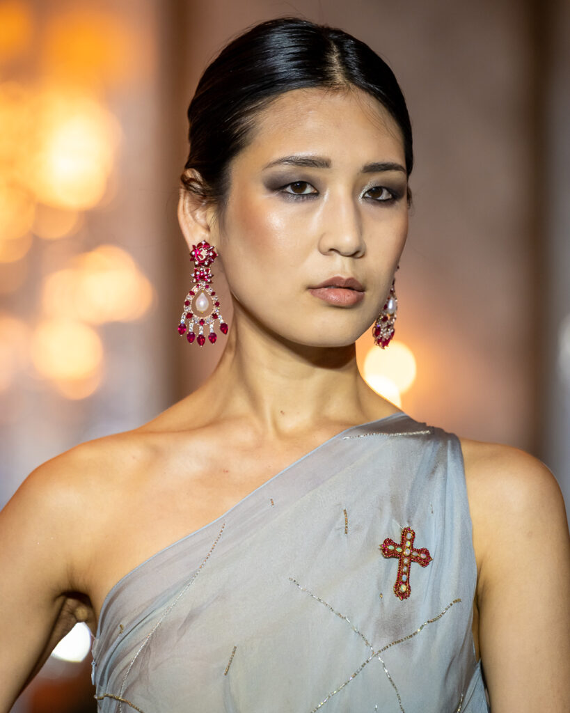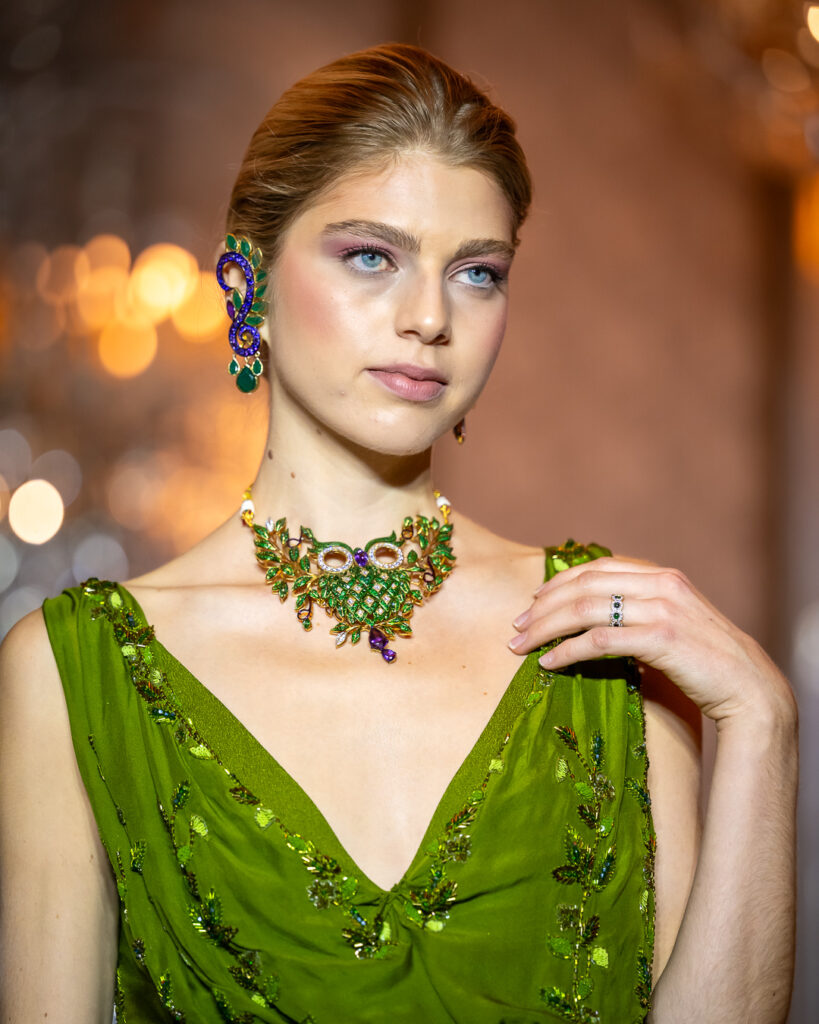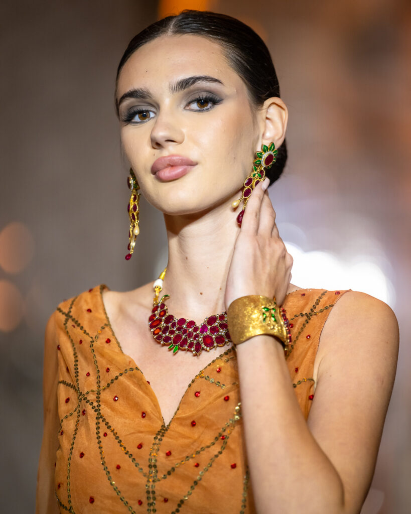 Bold statement pieces — from sculptural chokers and cascading gemstone earrings to nature-inspired hair adornments — were paired with fluid gowns in emerald green, molten gold, and fiery red, creating looks that shimmered with movement and meaning.