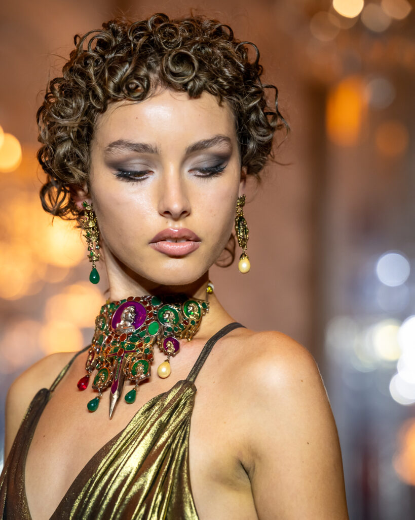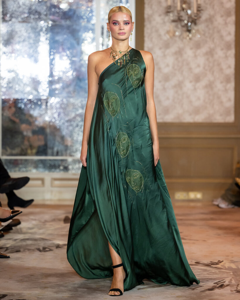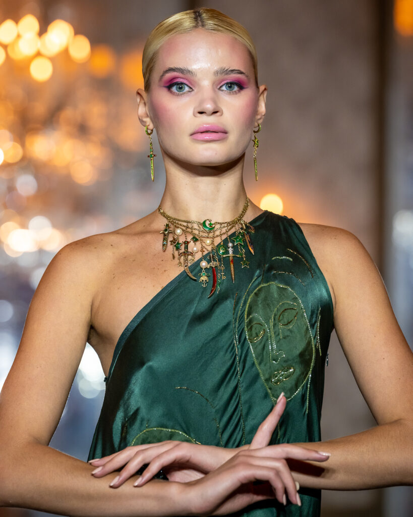 Snažni komadi nakita — od skulpturalnih ogrlica i visećih minđuša do ukrasa za kosu inspirisanih prirodom — bili su upareni s tečnim haljinama u smaragdno zelenoj, zlatnoj i vatreno crvenoj. Rezultat su bile kreacije koje su blistale pokretom i značenjem.
