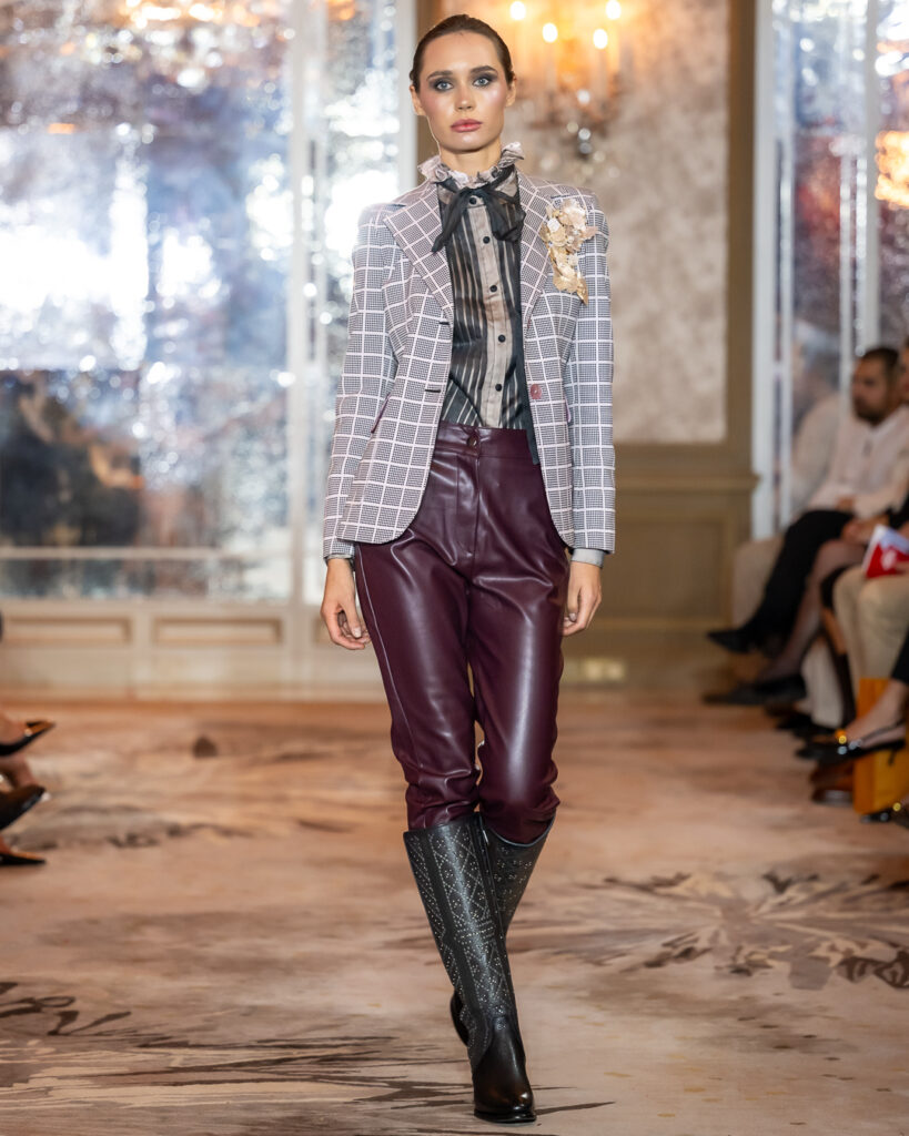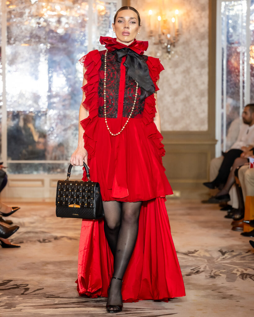 Structured silhouettes in deep burgundy, black, and jewel tones were accented with sculptural ruffles, bold accessories, and statement eyewear — redefining modern femininity with confidence and charisma. Each look spoke to the woman who leads with intention — fearless yet refined, expressive yet sophisticated.