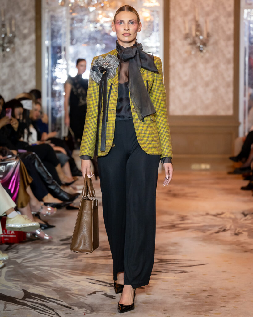 Zaštitni znak brenda — pelerina — provlačio se kroz svaki model, pretvarajući se u simbol snage i dostojanstva. Oštre linije, plemenite tkanine i dramatične siluete oblikovale su lik moderne heroine — samouverene, elegantne i nenametljive. Svaka kreacija bila je manifest ženskog liderstva i individualnosti.