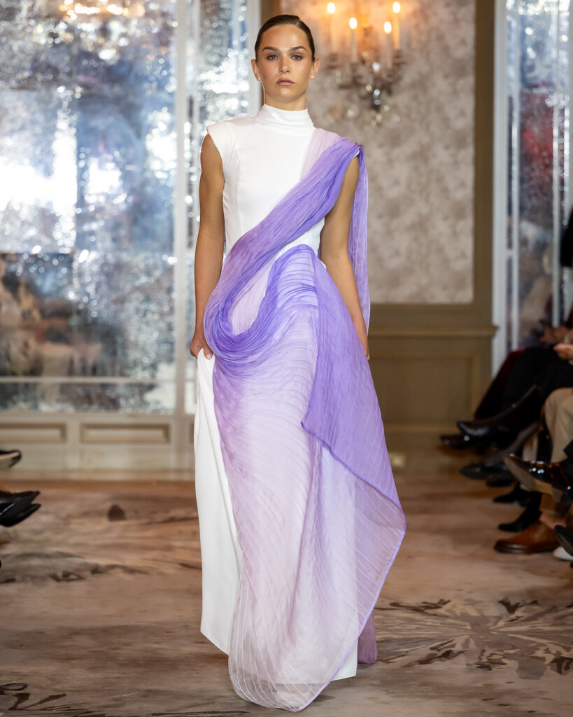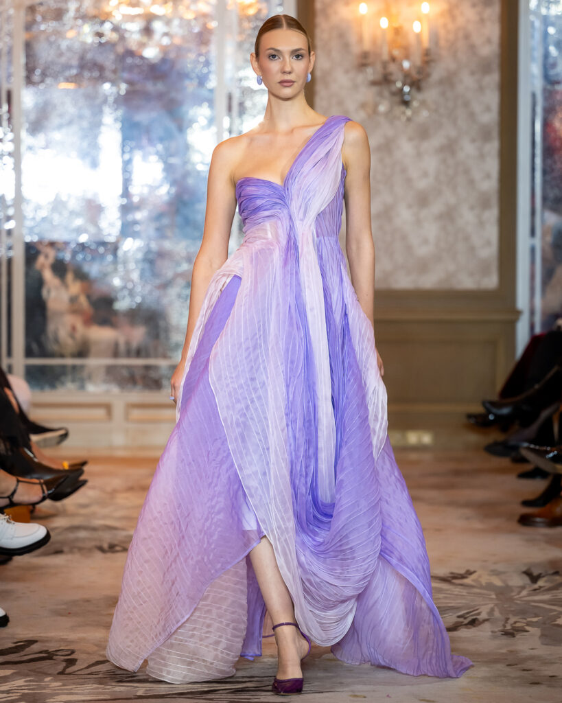 The collection presents a striking dialogue between softness and strength, where sculptural silhouettes meet fluid movement. Ethereal gowns in lavender gradients float like mist, crafted from delicately pleated fabrics that cascade around the body with weightless grace.