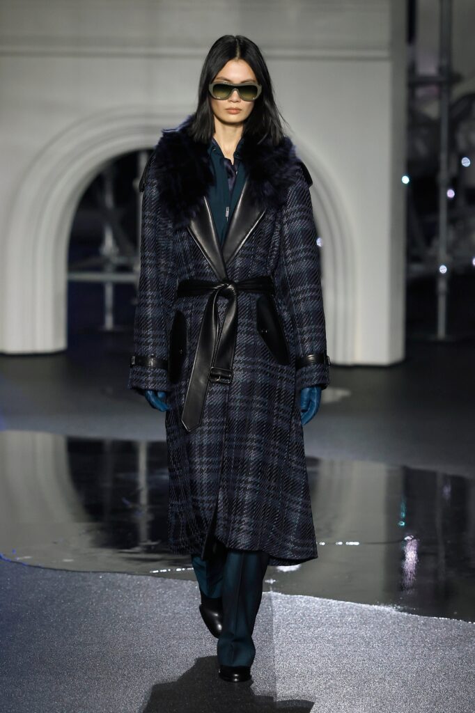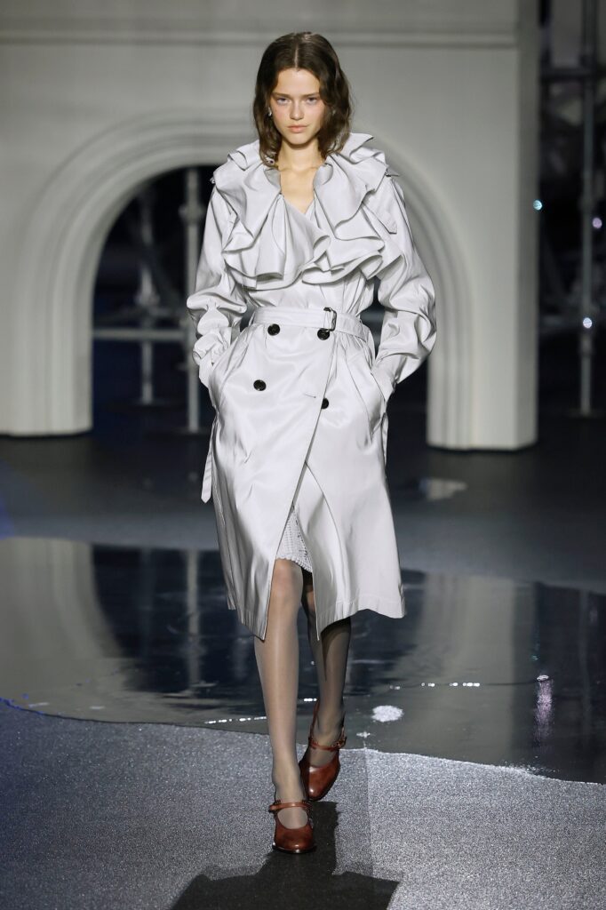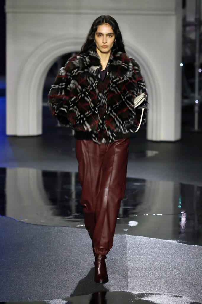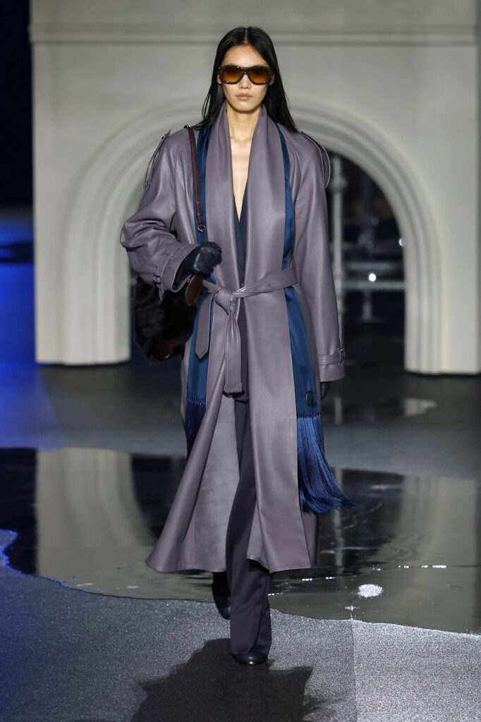 Novi kaputi od jagnjeć kože dolaze sa sjajnom stranom i strukturom od vunenog krzna na drugoj strani. Tu su i kožne moto jakne sa efektom uljanog sjaja koje prizivaju Burberry-jevu traženu indie sleaze eru, i stalni šuštaj trencha — sa naboranim kragnama, skraćeni sa blago naduvanom siluetom ili prebačeni „kao aksesoari preko elegantnih satenskih haljina“, kaže Lee — koji pokrivaju zaista poželjne komade, poput mornarsko plave svilenkaste haljine sa dubokim izrezom napred, ili bordo suknje sa resama koje klapću pri svakom koraku po pisti. Bilo je čak i zimskog kaputa tamno plave boje sa detaljnim prikazom mreže Londona preko tela, za svaki slučaj ako ti telefon ostane bez baterije i treba da stigneš kući u 4 ujutru bez Google Maps-a.