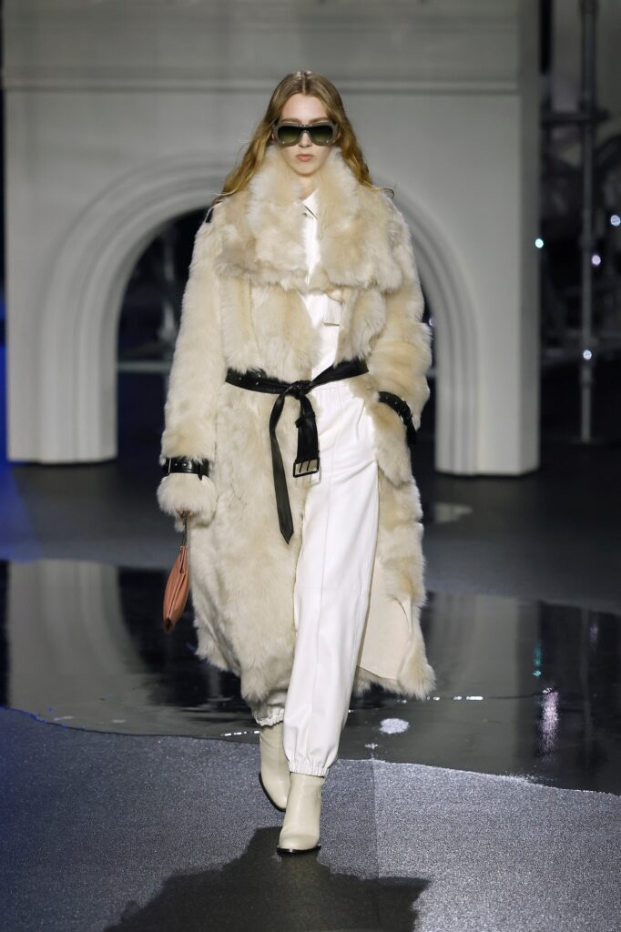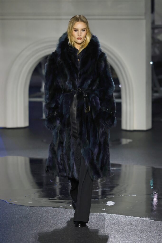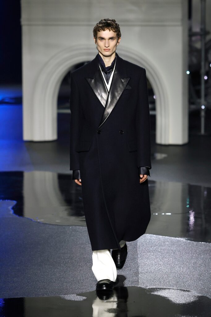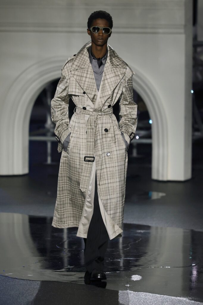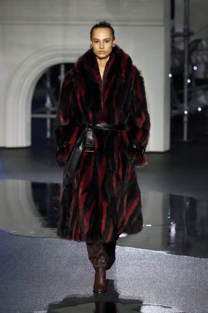 Novi kaputi od jagnjeć kože dolaze sa sjajnom stranom i strukturom od vunenog krzna na drugoj strani. Tu su i kožne moto jakne sa efektom uljanog sjaja koje prizivaju Burberry-jevu traženu indie sleaze eru, i stalni šuštaj trencha — sa naboranim kragnama, skraćeni sa blago naduvanom siluetom ili prebačeni „kao aksesoari preko elegantnih satenskih haljina“, kaže Lee — koji pokrivaju zaista poželjne komade, poput mornarsko plave svilenkaste haljine sa dubokim izrezom napred, ili bordo suknje sa resama koje klapću pri svakom koraku po pisti. Bilo je čak i zimskog kaputa tamno plave boje sa detaljnim prikazom mreže Londona preko tela, za svaki slučaj ako ti telefon ostane bez baterije i treba da stigneš kući u 4 ujutru bez Google Maps-a.