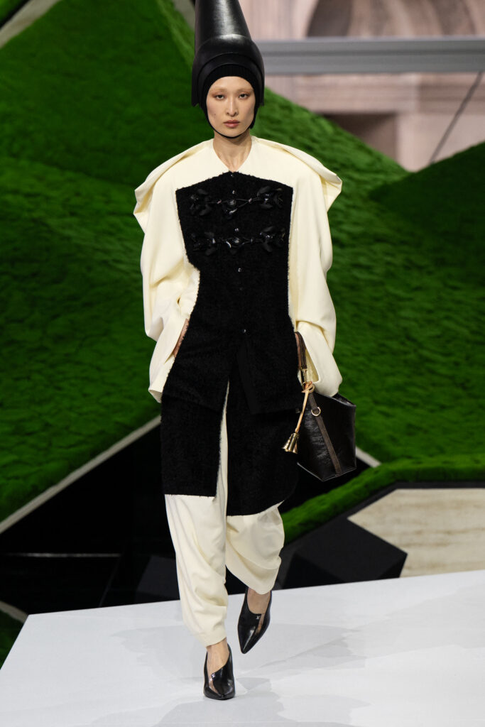 Da, kolekcija je obilovala upečatljivim kaputima i ekspresivnim šeširima. Ipak, čak i iza ekstremnijih, konceptualnih komada jasno su se prepoznavali klasični motivi kreativnog direktora Nicolas Ghesquière. Dominirali su proštepani kožni kaputi, karirani materijali u patchwork stilu, kao i veliki naborani okovratnici uz odgovarajuće kapice. Kada se pažljivije pogledaju detalji, primećuju se veliki dugmići, mali rančevi, naborane rukavice, ugrađeni korseti i suptilni aksesoari poput konusnih šešira sa „bubble“ proštepom.
