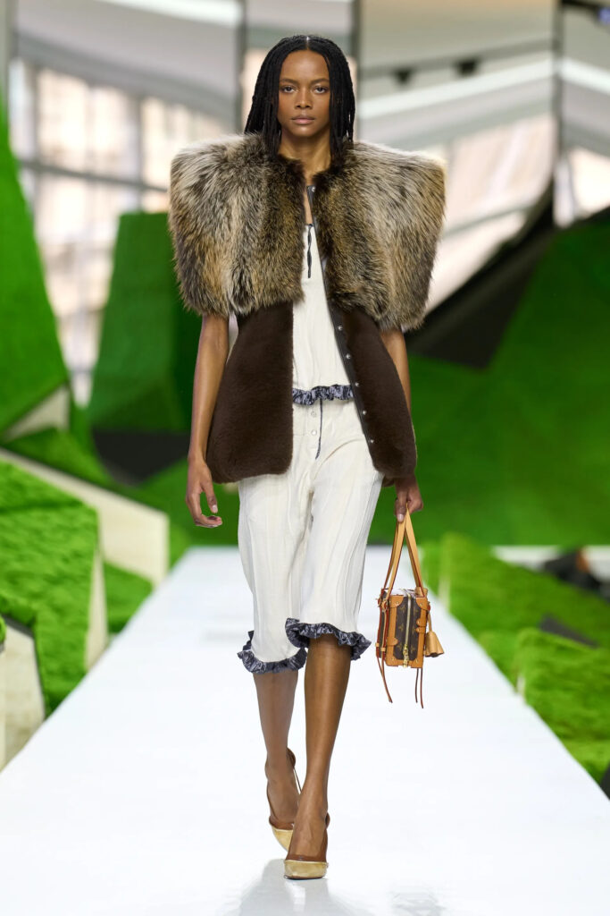 Zlatne ogrlice u obliku okovratnika i patchwork kombinacije inspirisane osamdesetim godinama dodavale su dinamičnu notu, dok su torbe u obliku planinskih koliba naglašavale kampersku estetiku. U kolekciji je bio prisutan i element utilitarizma: cvetne puf jakne osvežene su sjajnim materijalima, dok su uske pletene kape podsećale na pilotske kacige – kao da pitaju nosioca: „Spreman za poletanje?“ Može se reći da je ovo modni portal ka nekim zelenijim, spokojnim predelima.