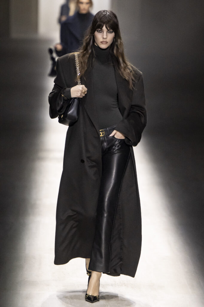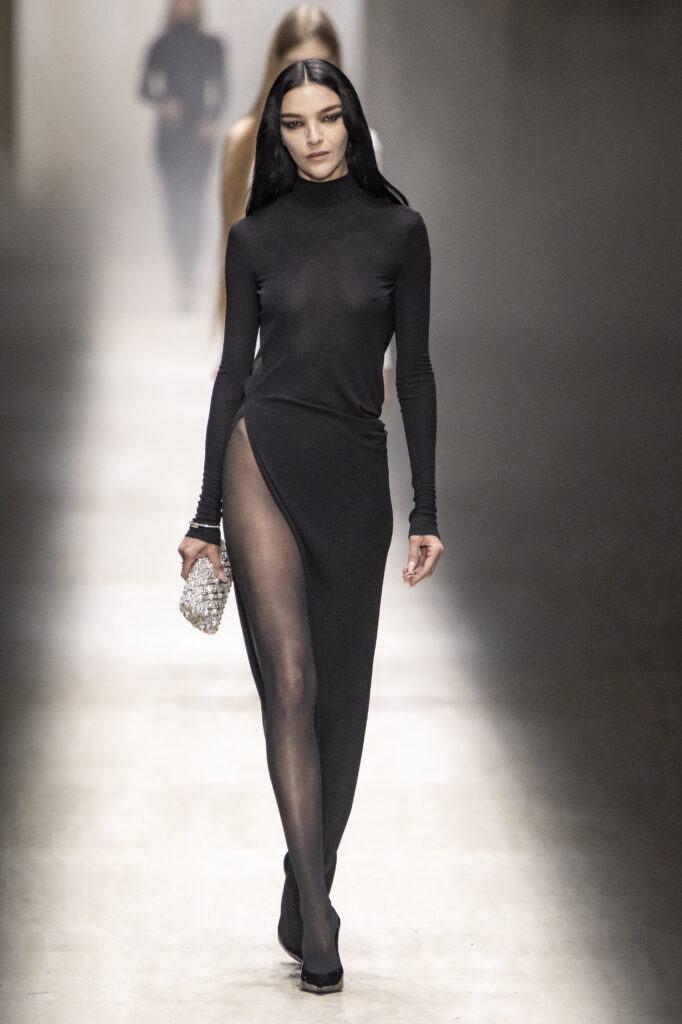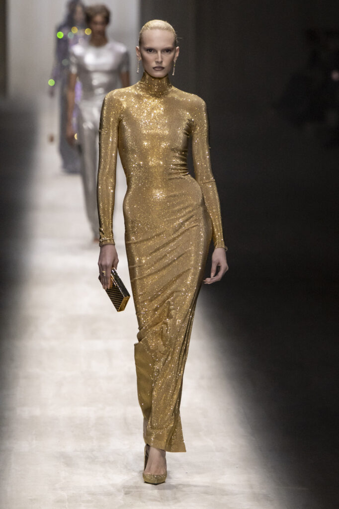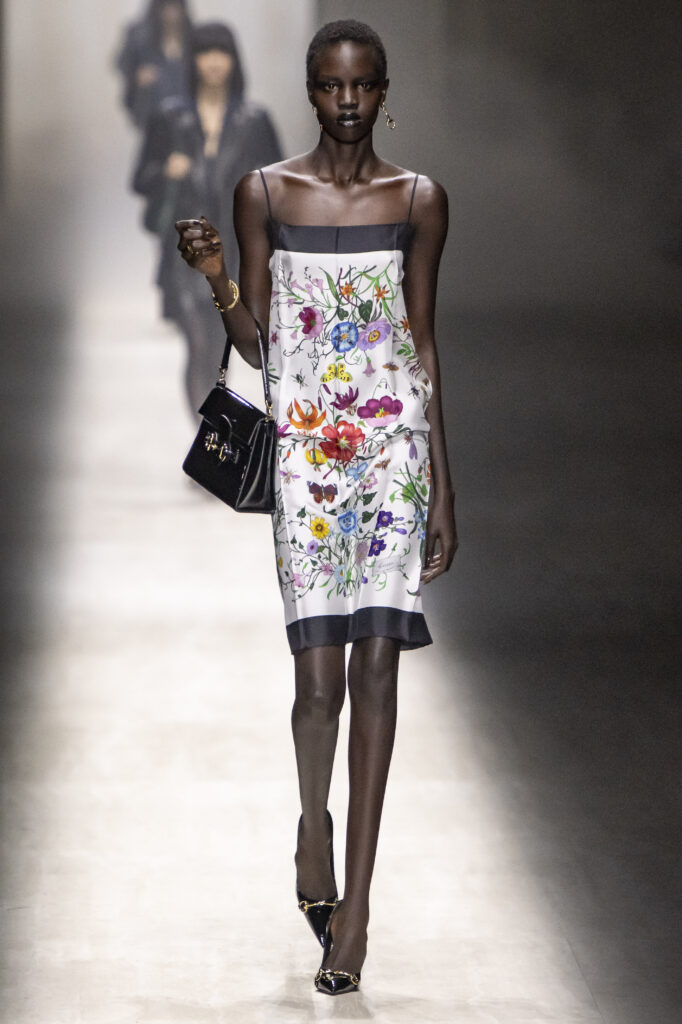 Demna je razmišljao o svojevrsnom „maksimalističkom minimalizmu“, što se videlo u svedenim, uskim odelima i pantalonama niskog struka sa smelim izrezima. Ekstravagantniji momenti pojavili su se u providnim, svetlucavim čipkanim kompletima. Flora print diskretno je prizvao inspiraciju „Primaverom“. A, očekivano, aksesoari su bili u prvom planu — od kultne Jackie torbe do špicastih salonki i zlatne lančane ogrlice koja se spuštala niz dekolte.