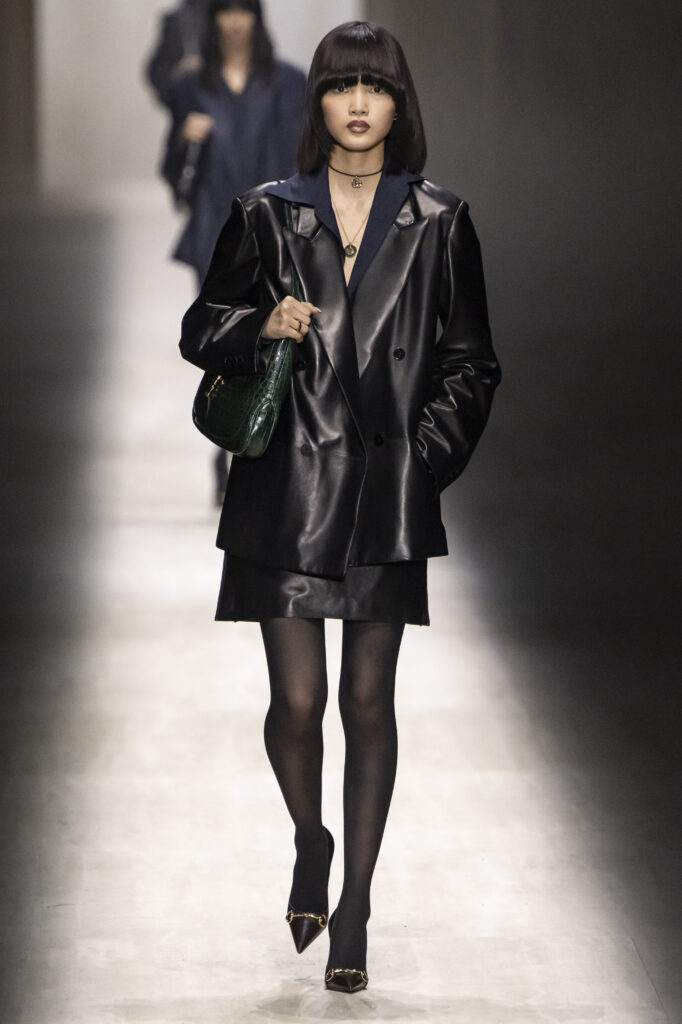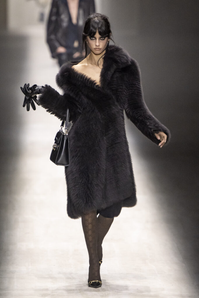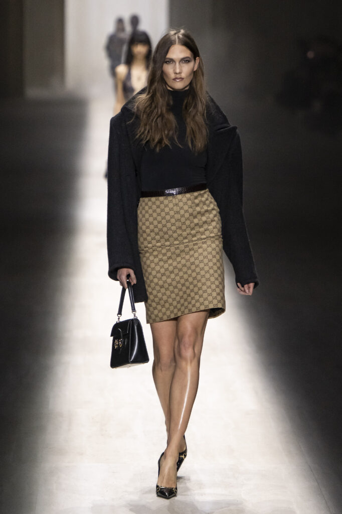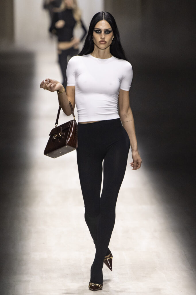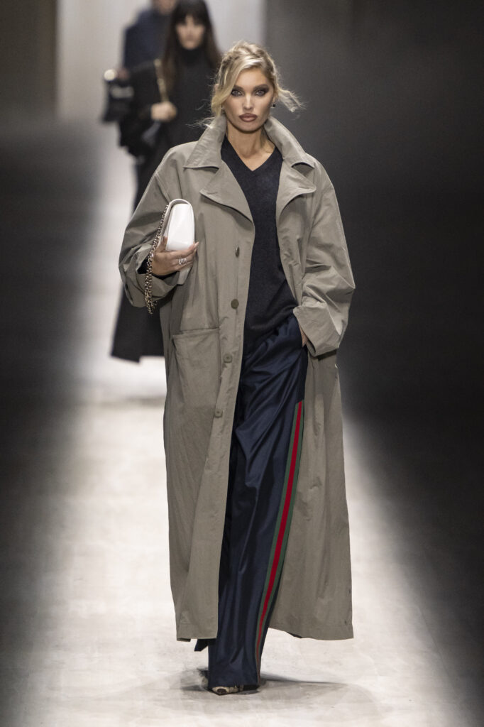 Koliko je nova kolekcija bila „Gucci“? I te kako. Reviju je otvorila uska bela mini-haljina koja je otkrivala tetovaže na nogama modela — „Niske strasti“ susreću Bušvik. Siluete su bile senzualne, pomalo upadljive i sa jakim prizvukom kasnih devedesetih, uz nostalgične omaže eri Tom Ford u Gucciju. Igrao se logotipima — od duplog G na kaiševima, preko brendiranih hulahopki i torbica oko struka, do prepoznatljivih zeleno-crvenih pruga na pantalonama, pa čak i obojenih u irokezu jednog modela.