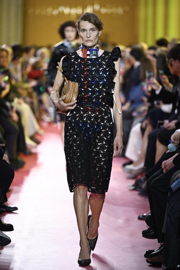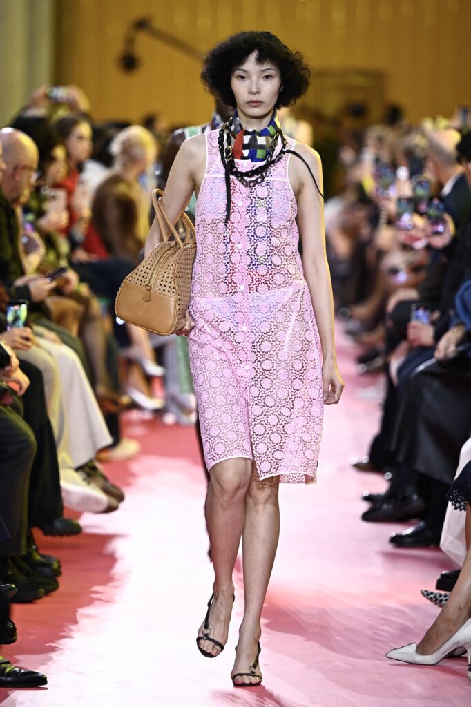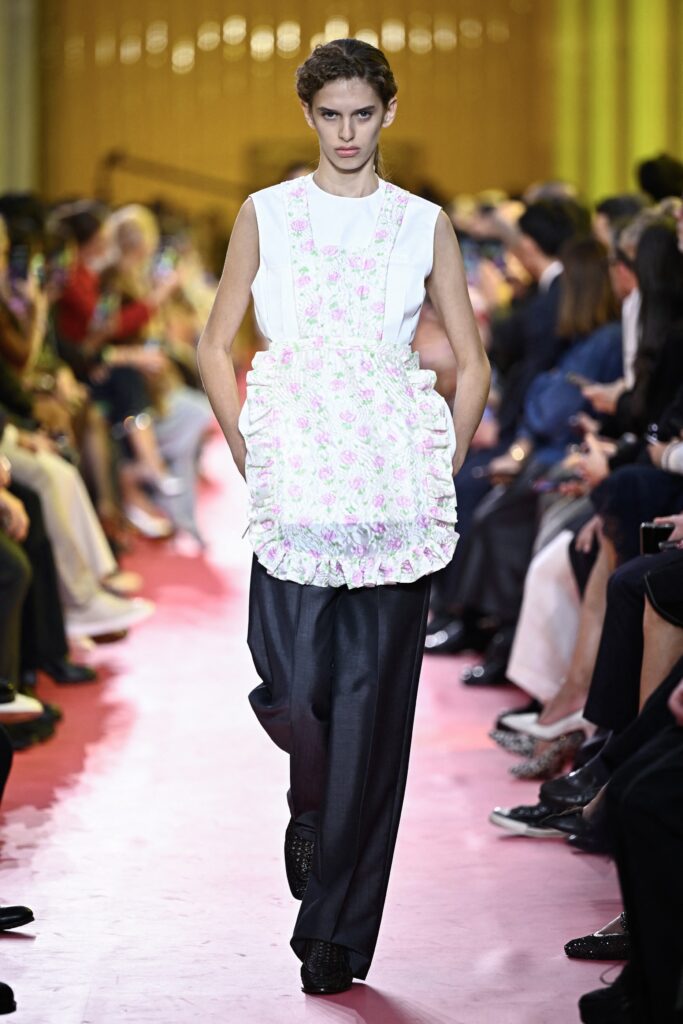 Sandra Huller otvorila je reviju u masivnoj, utilitarnoj fabričkoj kecelji, sa rukama u džepovima. Zaštitne kožne kecelje, pamučne bluze tipa pinafore, platnene torbe i kaiševi sa D-prstenovima, kao i zaštitne čizme, evocirali su opremu koju radnici nose preko svojih odeća kada počinju smenu.