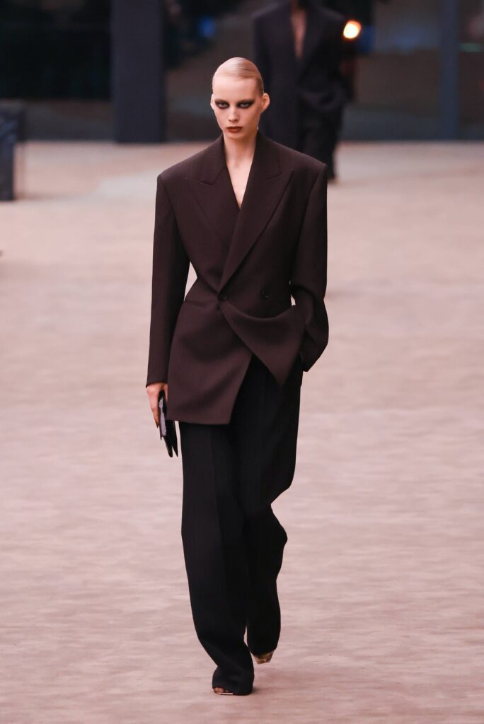 Pred sam kraj revije odela su se ponovo pojavila na pisti, ovaj put u kombinaciji sa dve upečatljive crne balske haljine od čipke, čiji su gornji delovi imali praktično ušivene džepove. Nakit je bio naglašen i upečatljiv, a štikle izrazito visoke. Svaki model imao je zaglađenu kosu skupljenu u nisku punđu sa razdeljkom sa strane, duboki bordo karmin i dramatičan „smoky eye“, za koji je bila zadužena čuvena šminkerka Pat McGrath. Taj izgled savršeno je predstavljao viziju YSL-a u interpretaciji Anthonyja. U celini gledano, jesenja kolekcija delovala je kao svojevrsna retrospektiva svega što je Vaccarello doneo kući Saint Laurent tokom protekle decenije: siluete koje prate liniju tela, provokativne materijale i moćna odela koja spajaju eleganciju i seksualnost na način koji očigledno ne gubi na aktuelnosti.