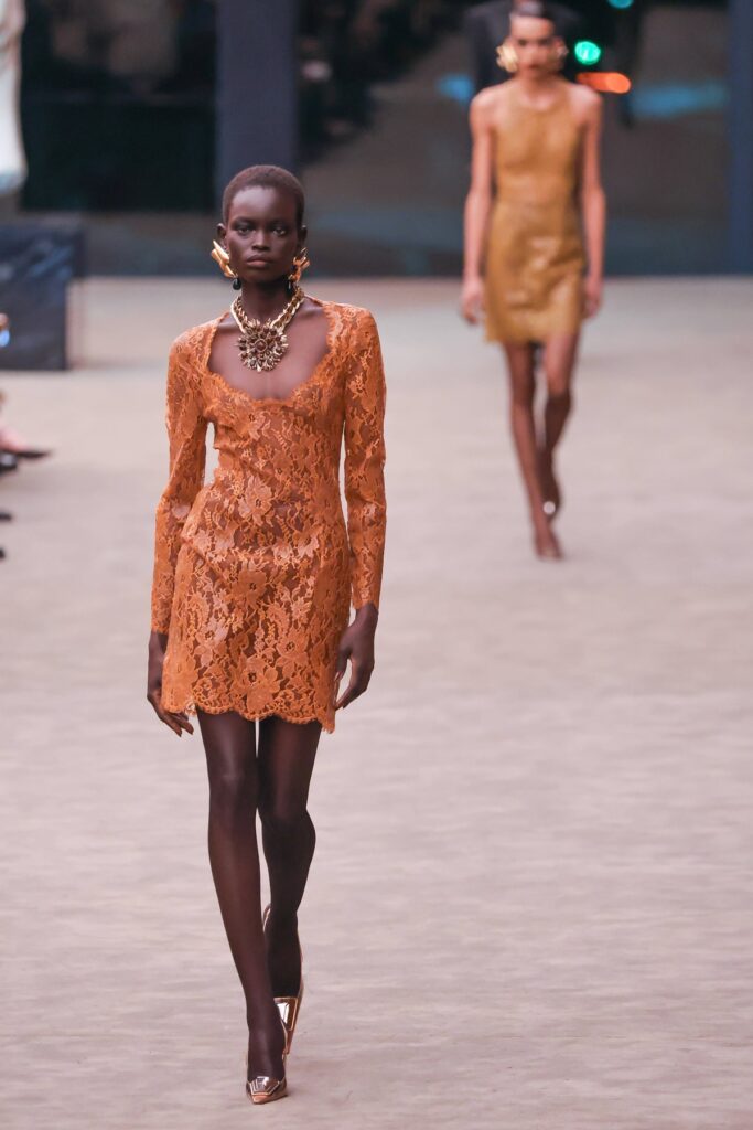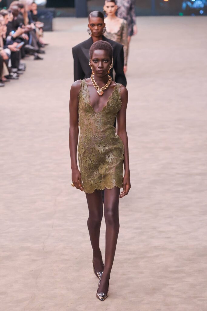 Scenografija je bila svedena i sofisticirana: pod je bio prekriven tepihom boje slonovače, dok su prostorom dominirali topli drveni zidovi u karamel nijansi, glatko zaobljeni i postavljeni duž centra potpuno zastakljene sale. Upravo takav ambijent Vaccarello gradi već deset godina za Saint Laurent – svet u kojem dominira naglašena senzualnost, ali i duboko poštovanje prema nasleđu Yves Saint Laurent-a. Istovremeno, njegova estetika jasno komunicira sa energijom savremene internet kulture.