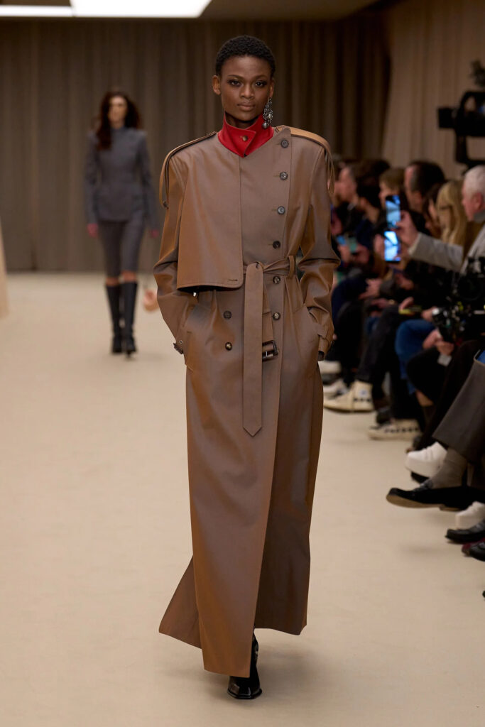 Krojeni komadi dobili su novu dimenziju zahvaljujući teksturalnim kontrastima, poput kožnih mantila, dok su fluidne siluete naglašene „waterfall“ ovratnicima i finim naborima. Oštro nasleđe kuće sa Savile Row bilo je kičmom kolekcije, dok je mekša umetnička strana dolazila do izražaja kroz ručno vezene cvetove inspirisane siluetama iz 1960-ih, džakard tkanine i odela od svilenog mikada. Kućni jakni postali su večernja odeća, a noćne košulje spoljna odeća, u igri između unutrašnjeg i spoljašnjeg.