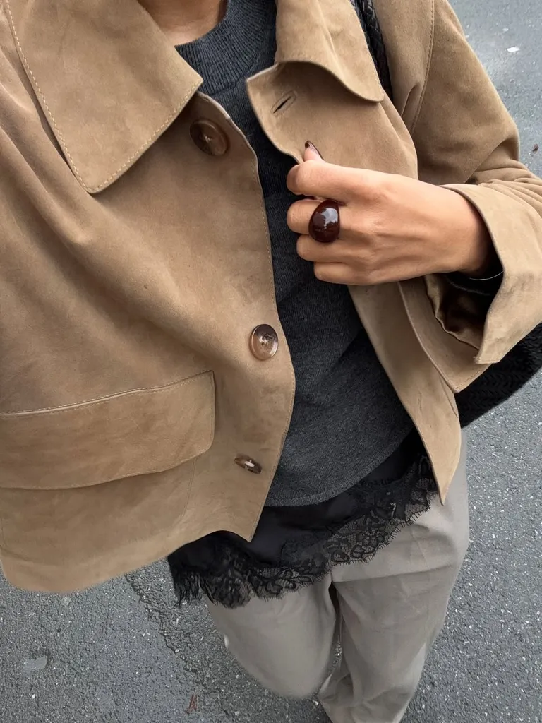 Meke jakne od antilopa sa klasičnom kragnom postaju jedna od najsofisticiranijih opcija ove sezone. Tekstura dodaje toplinu i bogatstvo, čineći čak i jednostavne outfite elegantnijim.