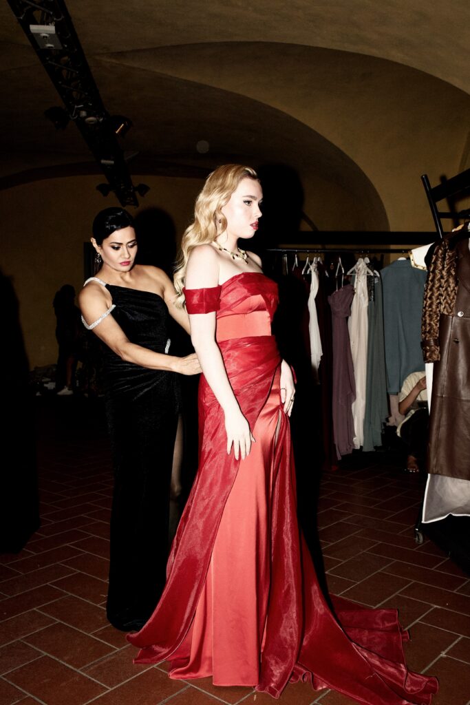 Rina’s design work has been featured in Vogue, Harper’s Bazaar, ELLE, and Marie Claire, with editorial recognition from Glamour and Grazia. That editorial precision translates seamlessly to the runway, where every seam, silhouette, and movement is intentional. Her approach feels less like spectacle and more like storytelling… garments constructed not just to be seen, but to be inhabited.