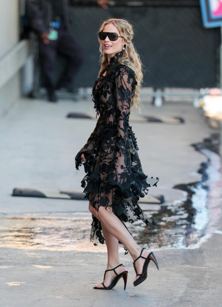 Kasnije, u emisiji Jimmy Kimmel Live, glumica poznata po filmu Birds of Prey nastavila je niz crnih mini-haljina, ovog puta u prozirnoj, čipkastoj kreaciji Alexandera McQueena, koju potpisuje Seán McGirr. Tamna, romantična haljina, ukrašena teksturiranim floralnim motivima i sirovim, nepravilnim ivicama, savršeno je dočarala spoj estetike 18. veka i 2026. godine.