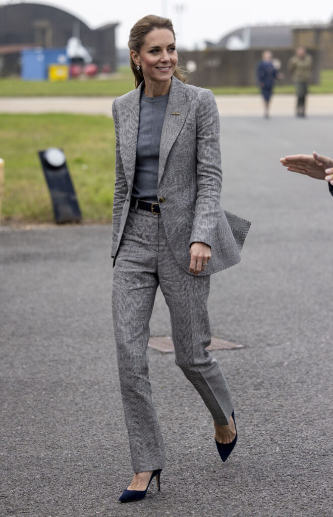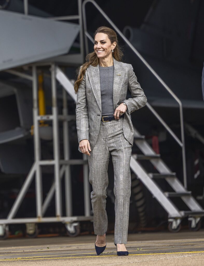Kate je obukla elegantno sivo karo odelo, krojeni sako i pantalone visokog struka sa ravnim nogavicama, kako bi posetila RAF Coningsby u Linkolnširu, Engleska, u blizini sela Coningsby.