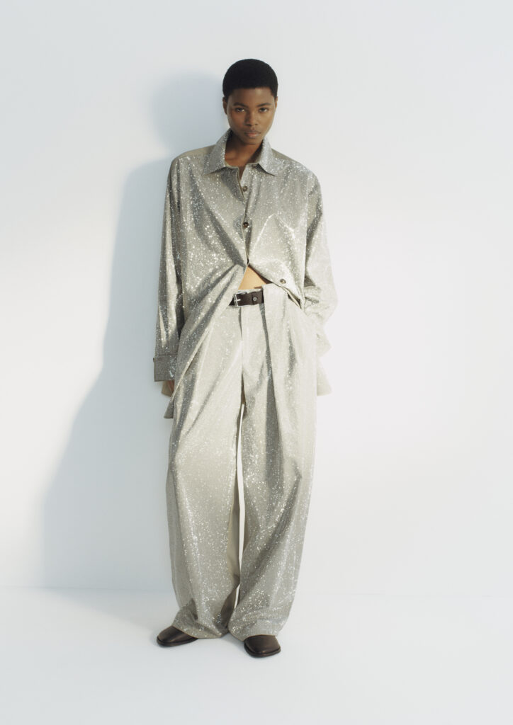 Segment aksesoara ostaje posebno naglašen, sa šest modela torbi — od manjih formata do oversized tote silueta, uključujući i bezvremensku torbu u čokoladnoj nijansi sa kaišem obogaćenim lancem. Falabella lanac pojavljuje se kao konstanta: na torbama, ogrlicama i minđušama od recikliranog metala u kombinaciji tonova, kao i na mokasinama, gde se pojavljuje kao suptilan, ali prepoznatljiv akcenat.