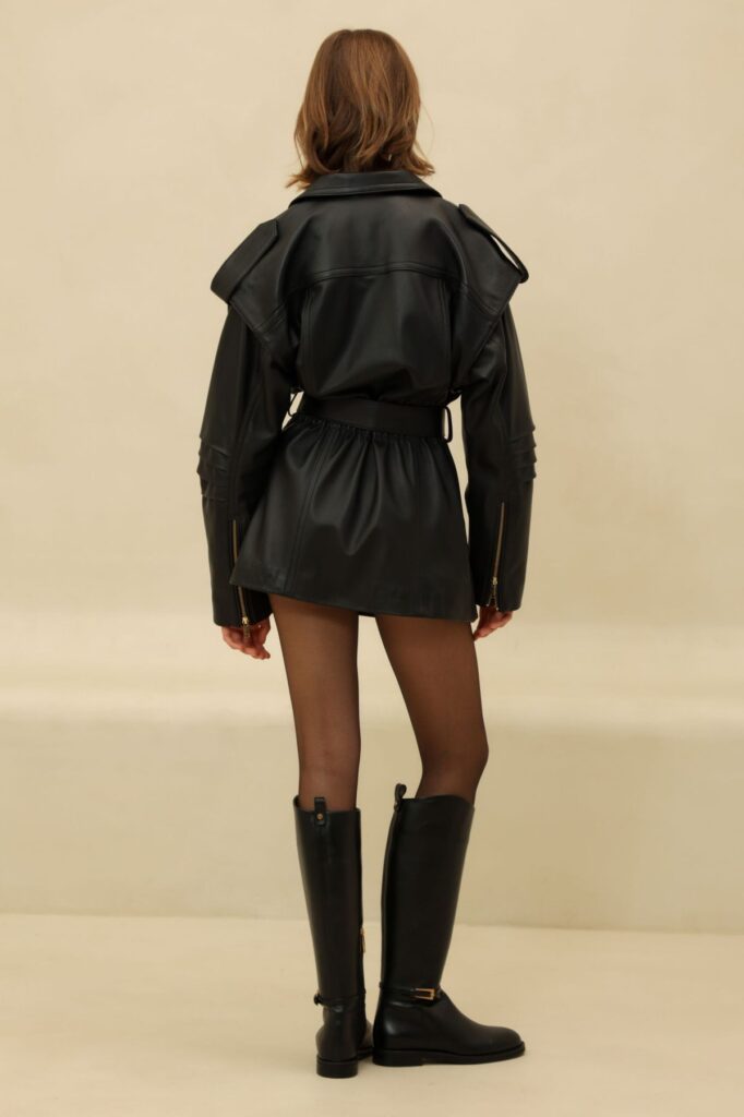 Za razliku od prijašnjih sezona, ove jeseni kožna jakna se ne nameće – ona se uklapa. Nosi se otvoreno, nehajno prebačena preko ramena ili stegnuta kaišem poput skulpturalnog pojasa. U kombinaciji sa klasičnim pantalonama visokog struka i tankim rolkama stvara se vizuelna harmonija između strukture i lakoće. U večernjim prilikama, mekana koža preuzima ulogu sakoa: dovoljno elegantna da uokviri svilu ili čipku, a dovoljno čvrsta da zadrži stav.